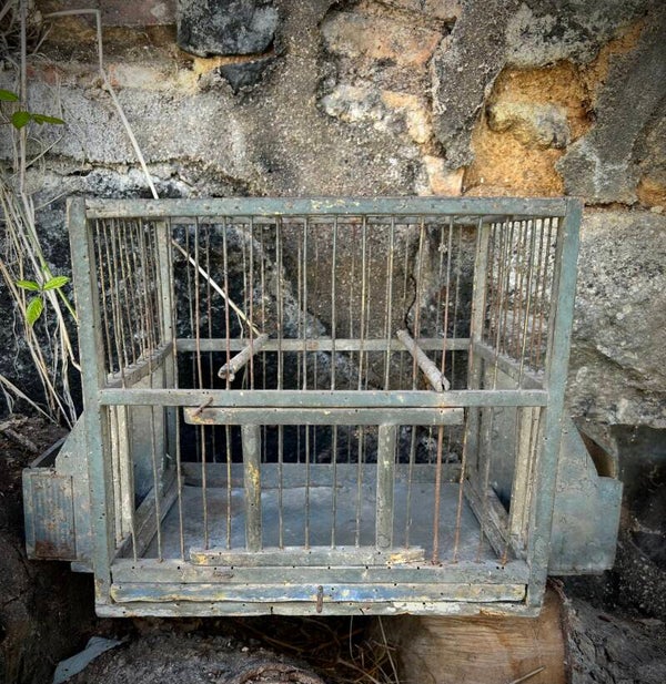 Sfeervolle, doorleefde vogelkooi uit Frankrijk met een prachtig blauw vergrijsde kleur. De kooi heeft een karaktervol en verweerd uiterlijk dat direct charme toevoegt aan je interieur.