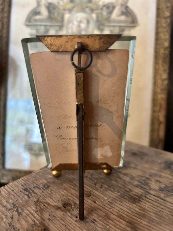 Frans lijstje met bidprentjeCharmant Frans lijstje met origineel bidprentje. Het lijstje is zowel op te hangen als neer te zetten — perfect voor een mooi plekje in huis.Afmetingen: 6 cm breed x 10 cm hoog.