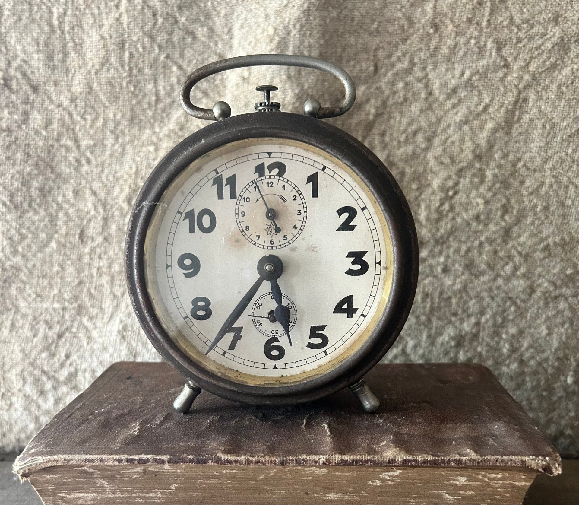 Prachtige vondst uit Frankrijk: een karaktervolle oude wekker met een mooi verweerde uitstraling. De tijd heeft op charmante wijze zijn sporen achtergelaten, wat dit stuk bijzonder decoratief maakt.