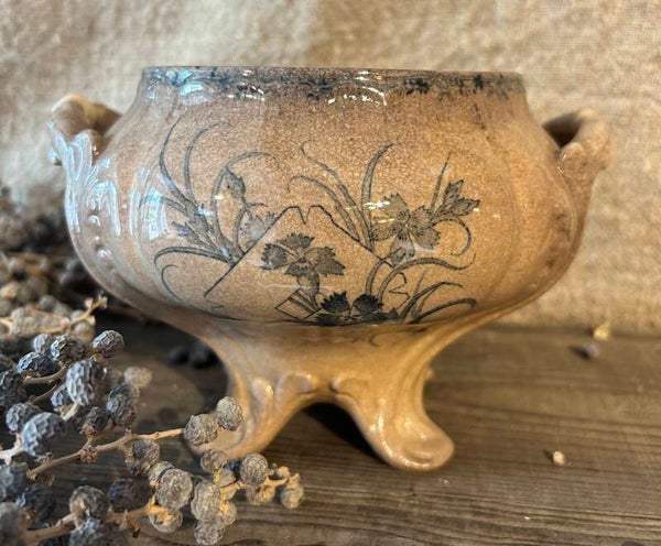 Sierlijke, volledig beboterd aardewerken terrine met een klassieke blauwe bloemdecoratie. Deze decoratieve terrine staat op elegante pootjes en heeft een glanzende afwerking die het stuk een verfijnde en nostalgische uitstraling geeft.