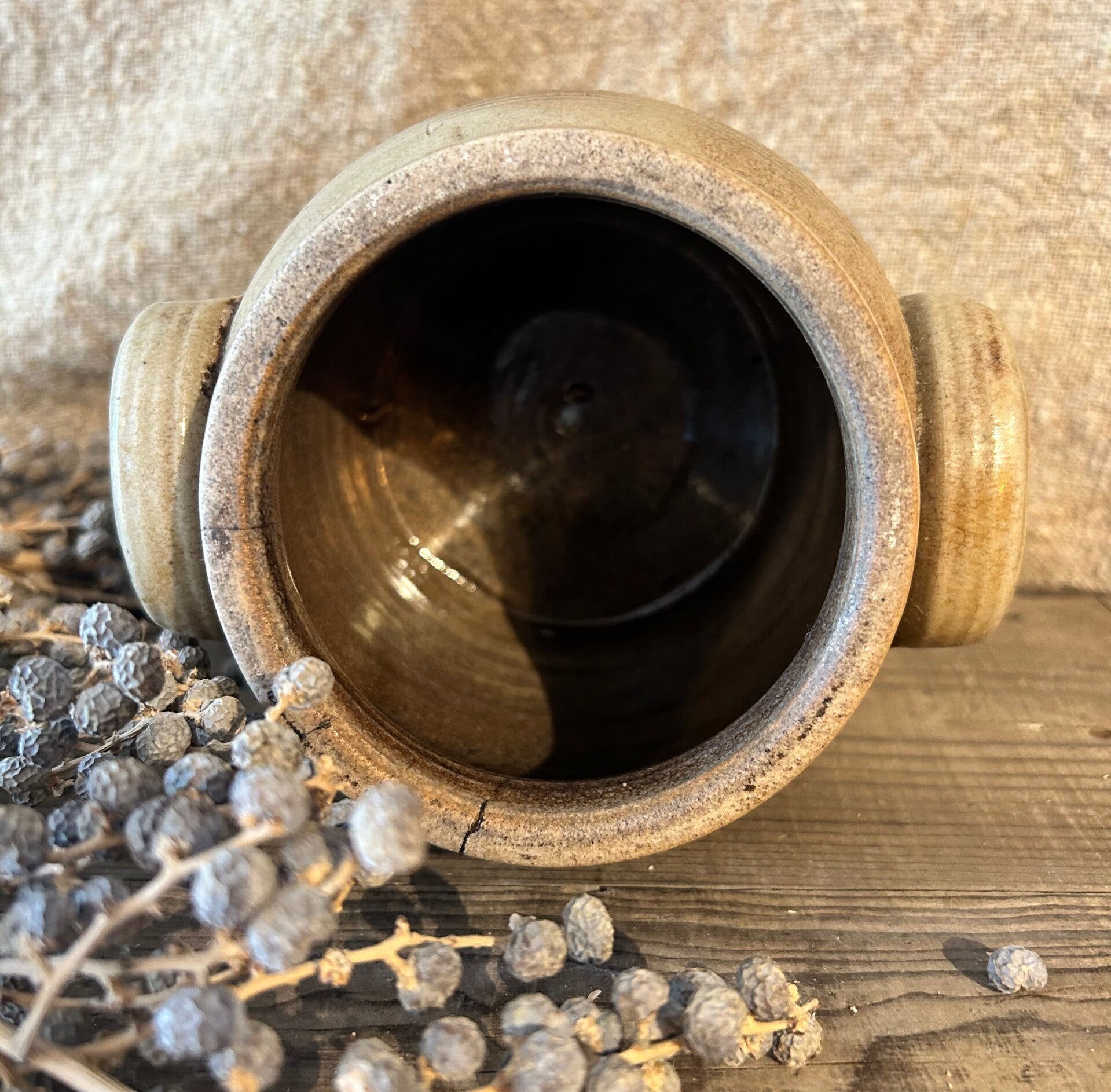 Rustiek beboterd grespotje met een warme uitstraling en glanzende afwerking. Dit potje heeft een zichtbaar scheurtje – een klein schoonheidsfoutje dat juist bijdraagt aan zijn charme en doorleefde karakter.