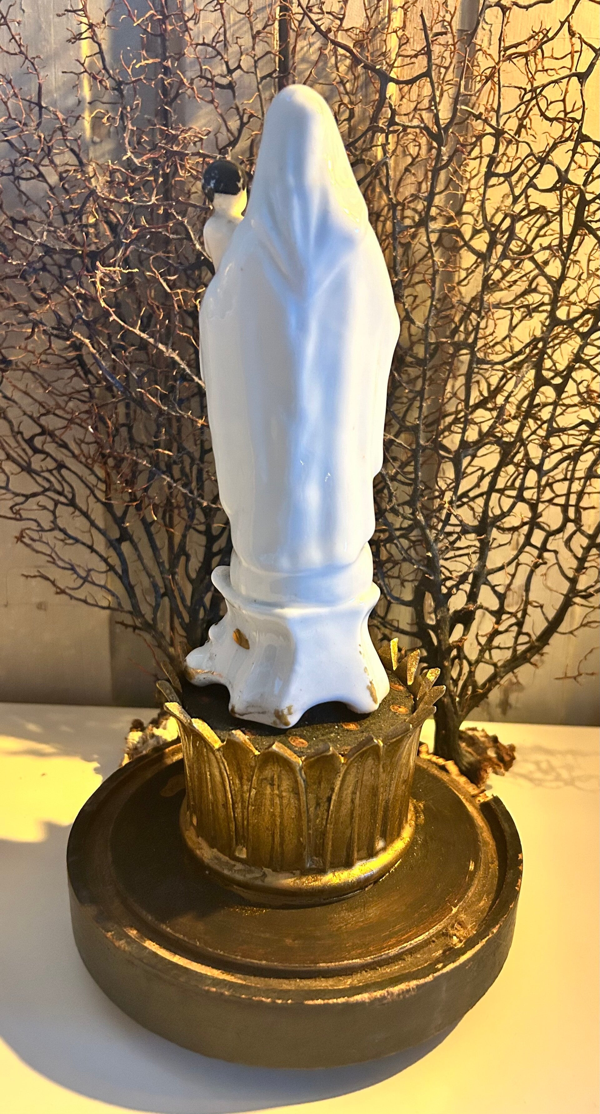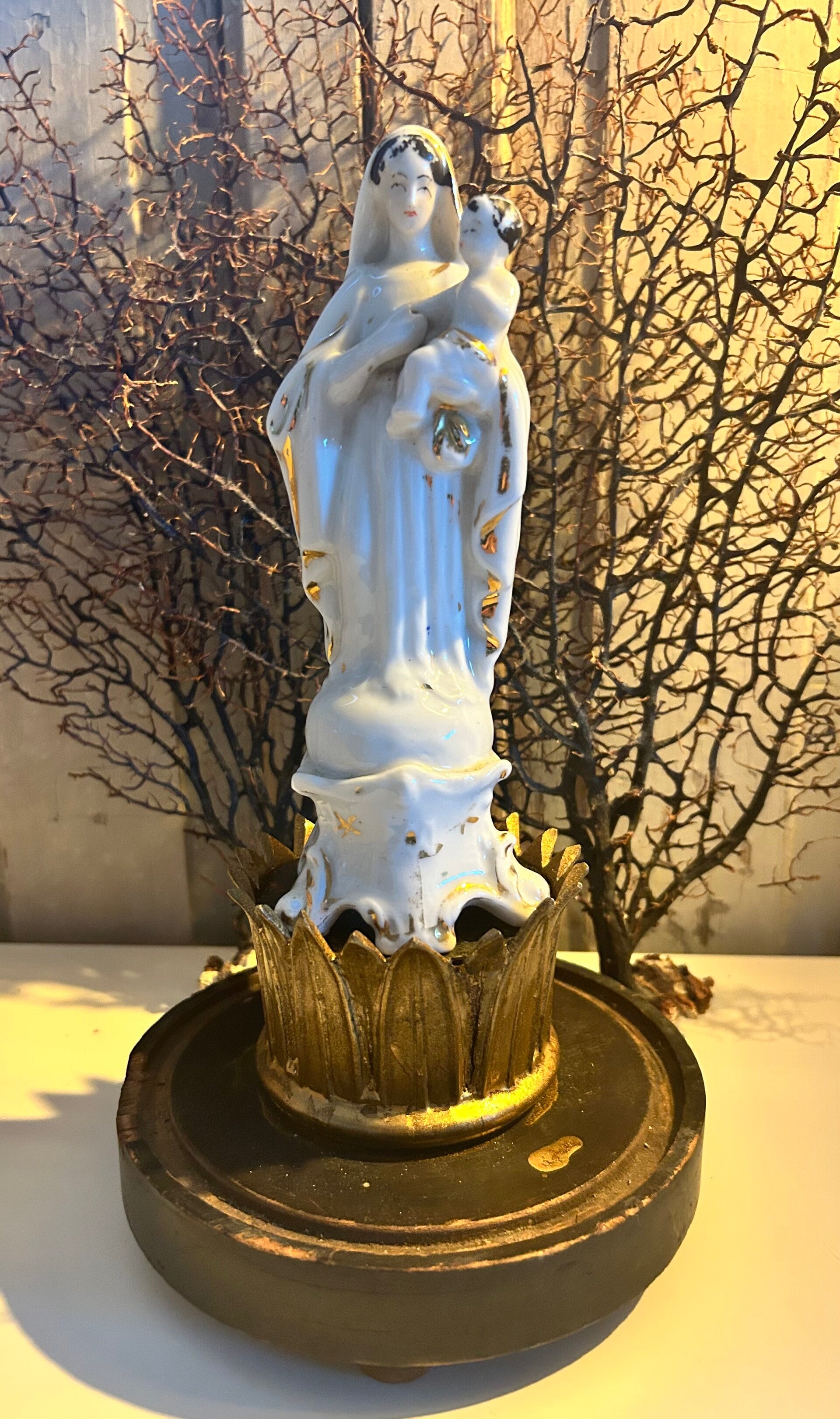 Fijn biscuitporseleinen beeldje van Maria (Madonna) met het kindje Jezus op haar arm. Geplaatst op een stolpplateau. Waarschijnlijk van Franse oorsprong, eind 19e of begin 20e eeuw.