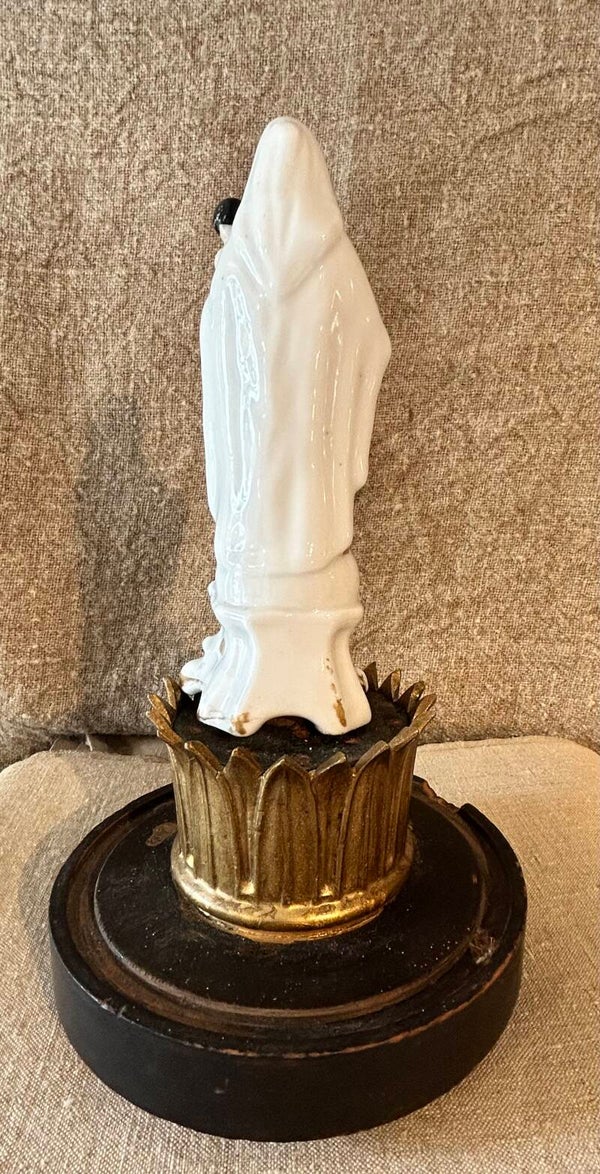 Fijn biscuitporseleinen beeldje van Maria (Madonna) met het kindje Jezus op haar arm. Geplaatst op een stolpplateau. Waarschijnlijk van Franse of Duitse oorsprong, eind 19e of begin 20e eeuw.