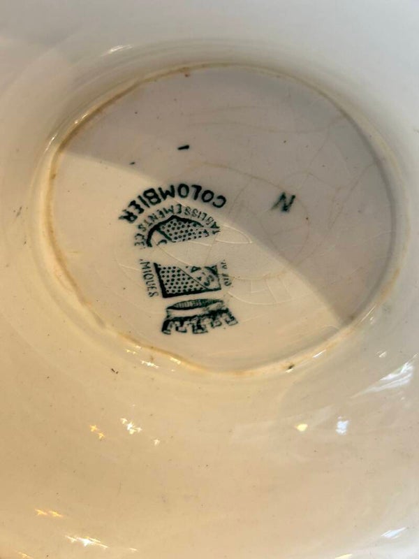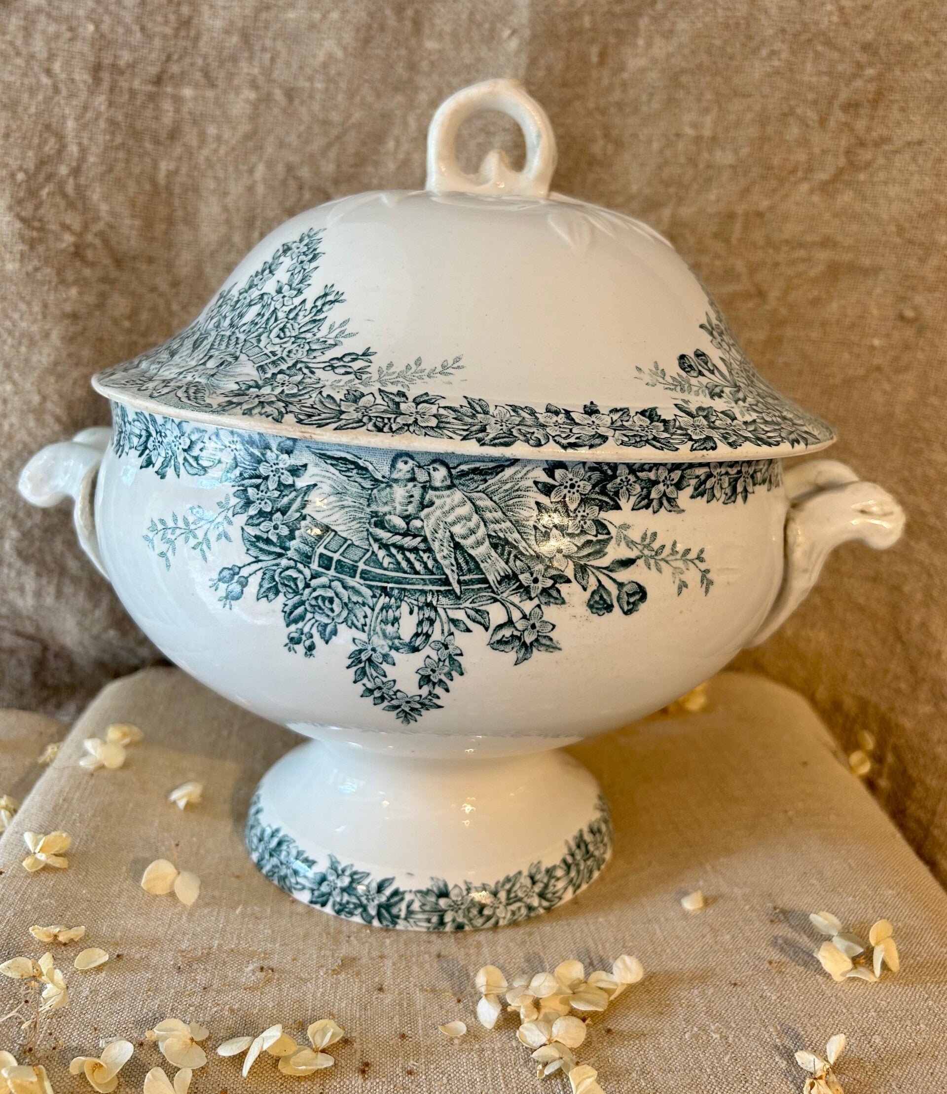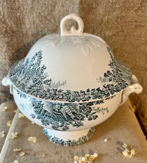 Elegante terrine in gebroken wit, liefdevol versierd met blauwe vogeltjes en bloemetjes. Een sfeervol stuk uit Frankrijk dat karakter en nostalgie toevoegt aan elke tafel.
