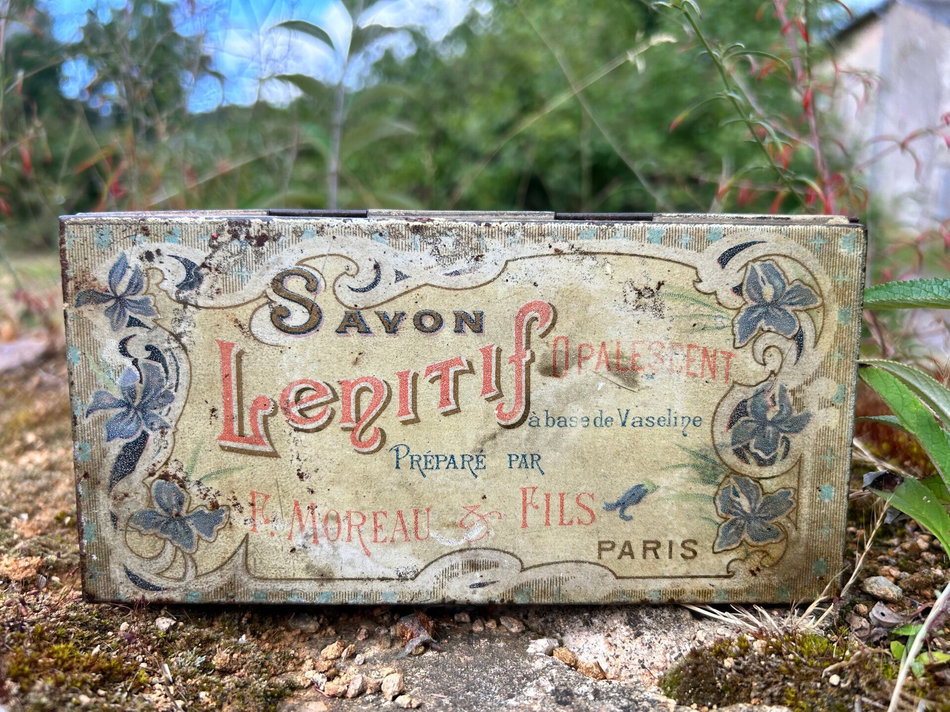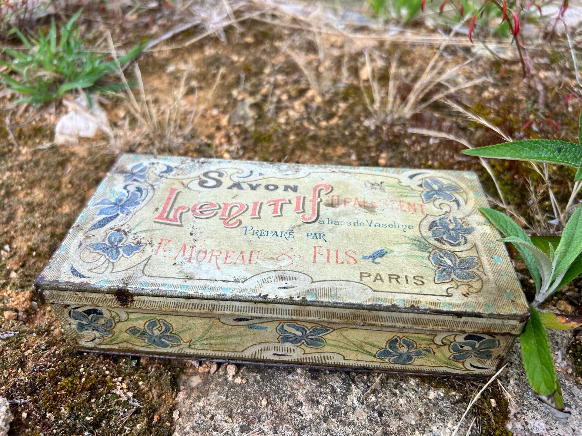 Charmant metalen blikje afkomstig uit Frankrijk, oorspronkelijk gebruikt voor Savon (zeep). Dit item ademt Franse elegantie en nostalgie uit, perfect als decoratief object of om kleine spulletjes in te bewaren.