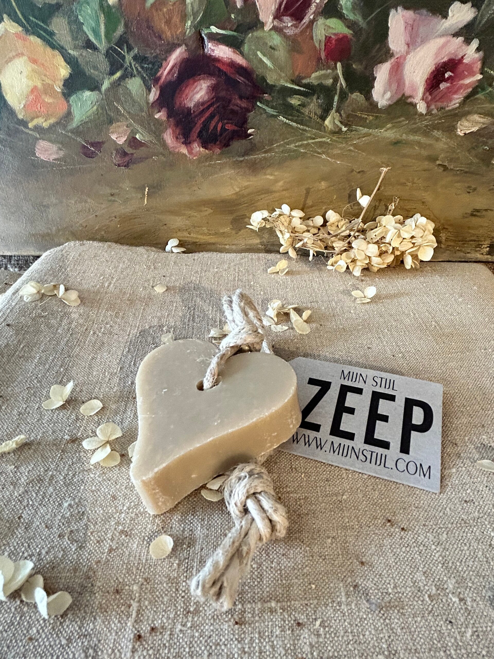 Liefdevol vormgegeven zeep in de vorm van een hart, aan een koord van het merk Mijn Stijl. De zachte beige kleur en subtiele geur maken deze zeep tot een stijlvolle en functionele toevoeging aan badkamer, toilet of keuken. Praktisch op te hangen en ook leuk als klein cadeau.