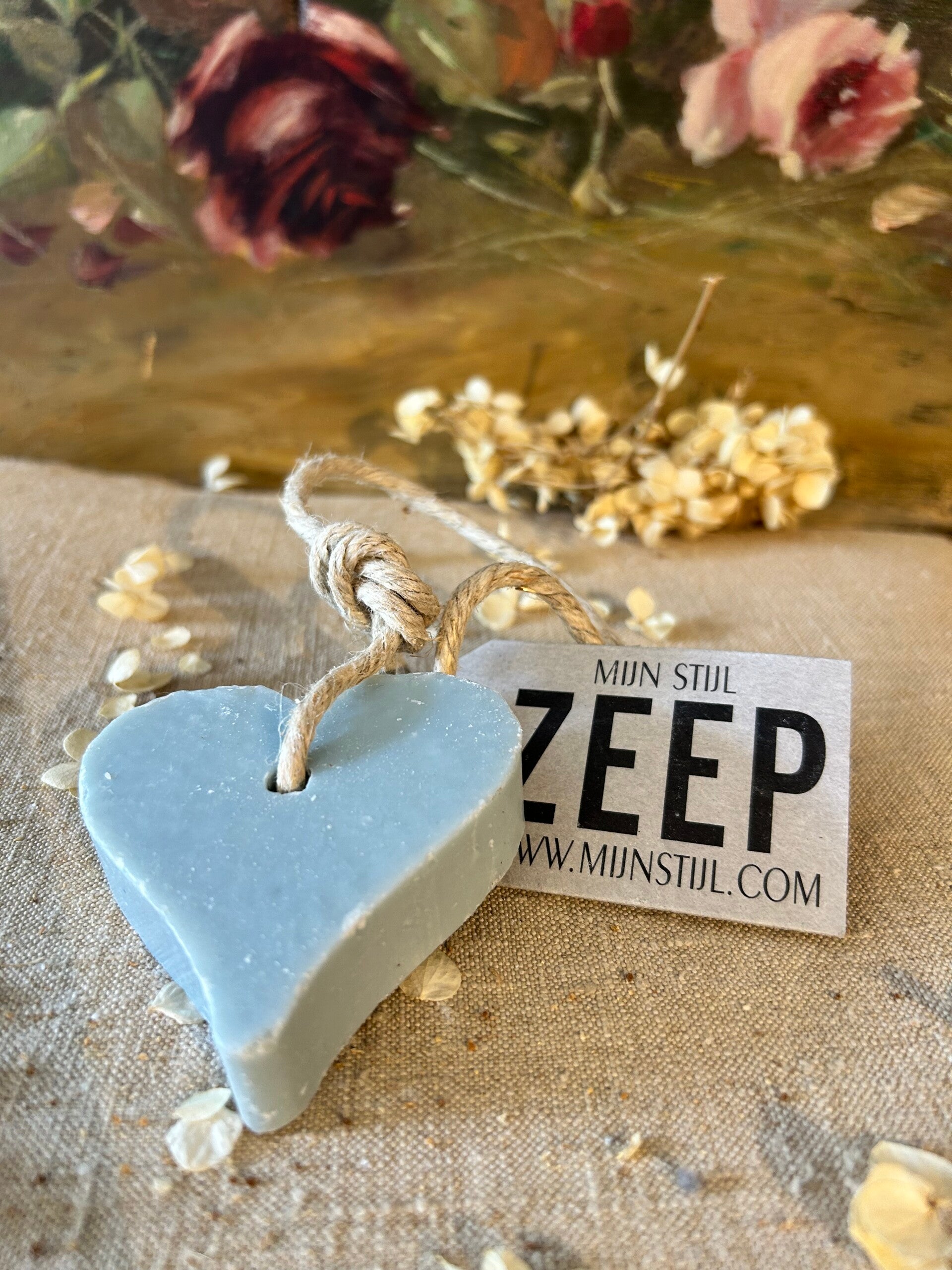 Liefdevol vormgegeven zeep in de vorm van een hart, aan een koord van het merk Mijn Stijl. De zachte babyblauwe kleur en subtiele geur maken deze zeep tot een charmante en decoratieve toevoeging aan badkamer, toilet of keuken. Ook ideaal als klein en stijlvol cadeautje.