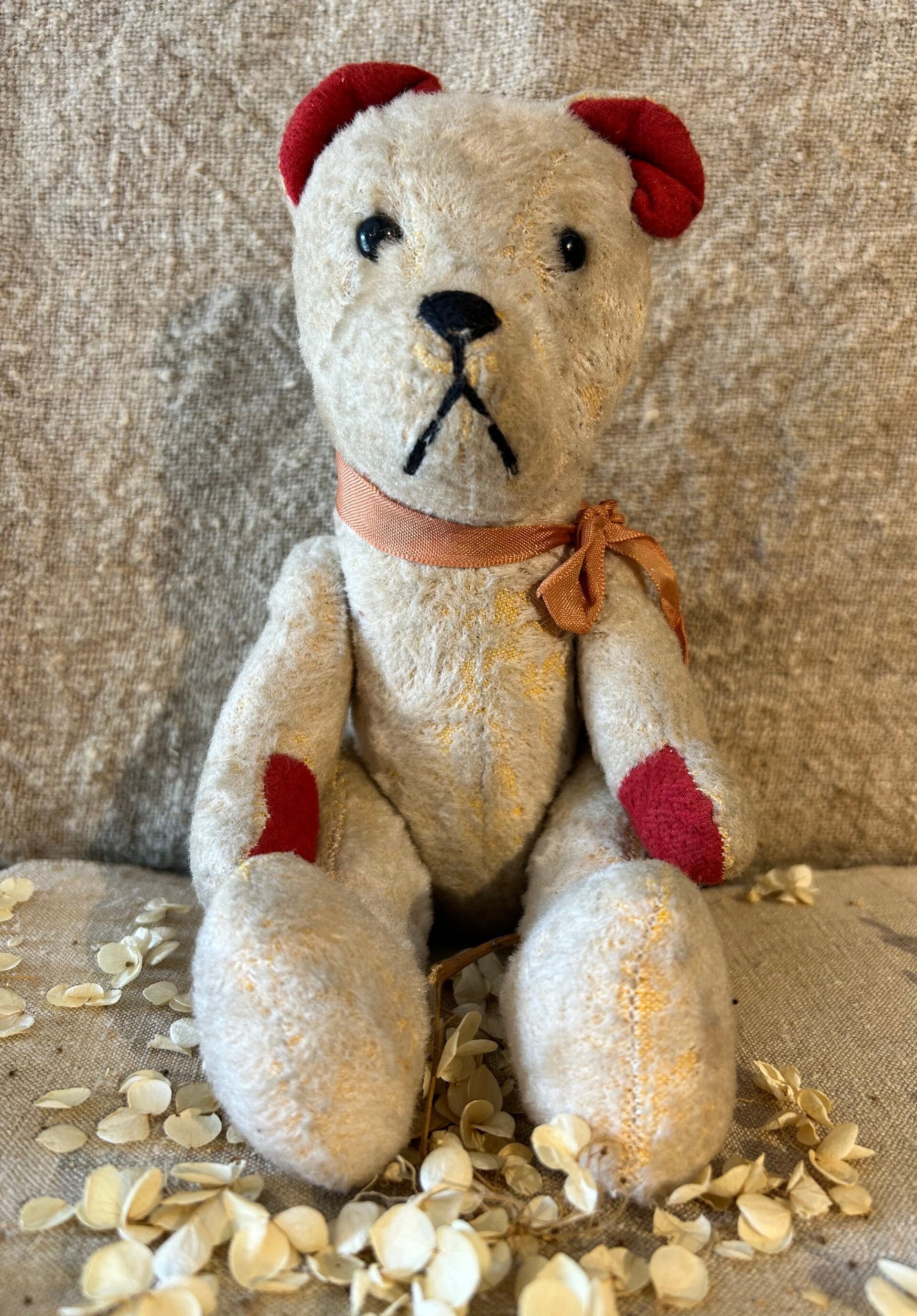 Breng warmte en nostalgie in huis met dit charmante, sleetse beertje. Het knuffelbeertje is wit van kleur en heeft schattige rode pootjes en oortjes, wat hem een uniek en liefdevol karakter geeft. Perfect als decoratief item of als hartverwarmend cadeau.