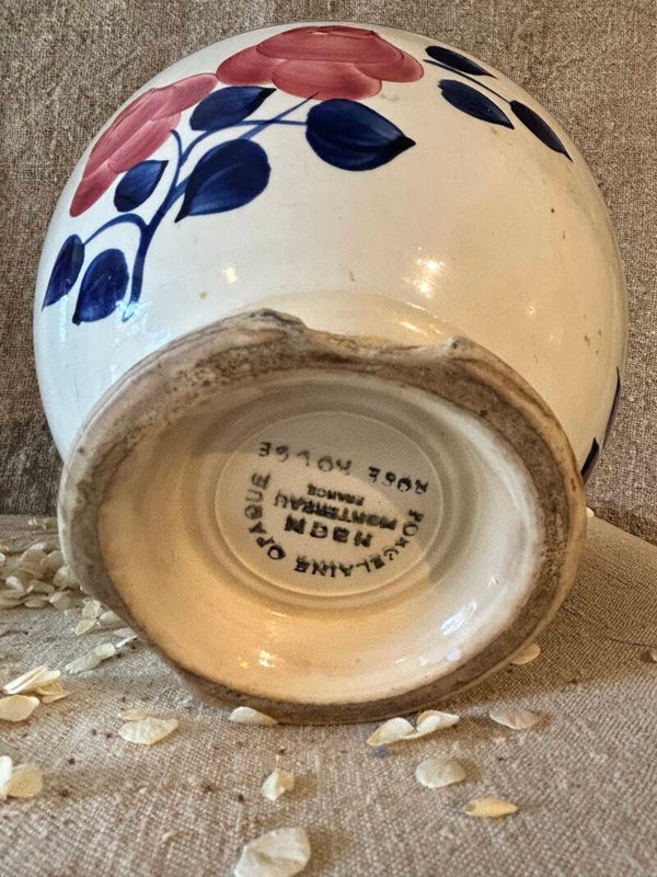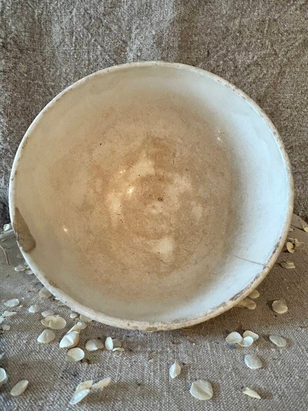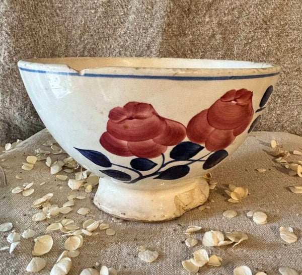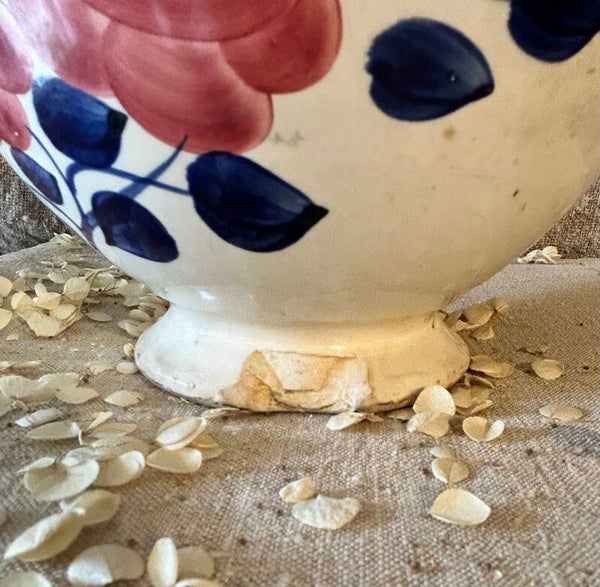Deze prachtige, sleets gebruikte spoelkom draagt de sporen van een rijk verleden. Hier en daar een chip, subtiele gebruikssporen – allemaal tekenen van een leven vol verhalen. De kom is beboterd met sierlijke bloemen die haar een zachte, romantische uitstraling geven.