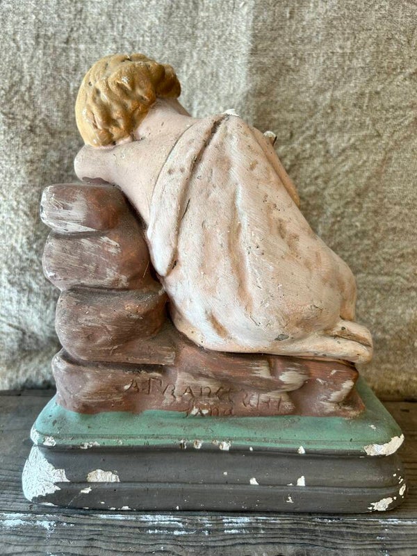 Op zoek naar een uniek, religieus beeld met karakter? Dit bijzondere Janneke-beeld draagt de sporen van de tijd en vertelt een verhaal zonder woorden. Met zijn sleets doorleefde uitstraling, verweerde details en authentieke brocante charme, is dit beeld een echte blikvanger voor liefhebbers van religieuze kunst, antiek decor en doorleefde interieurs.