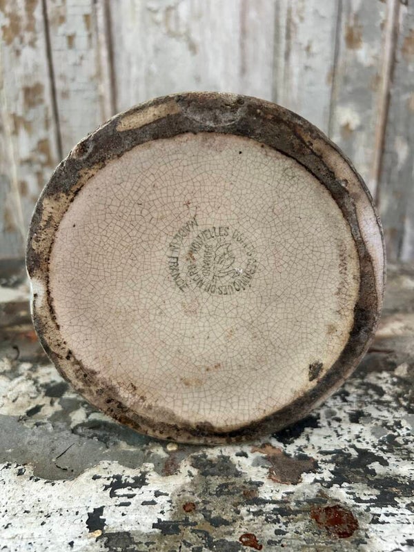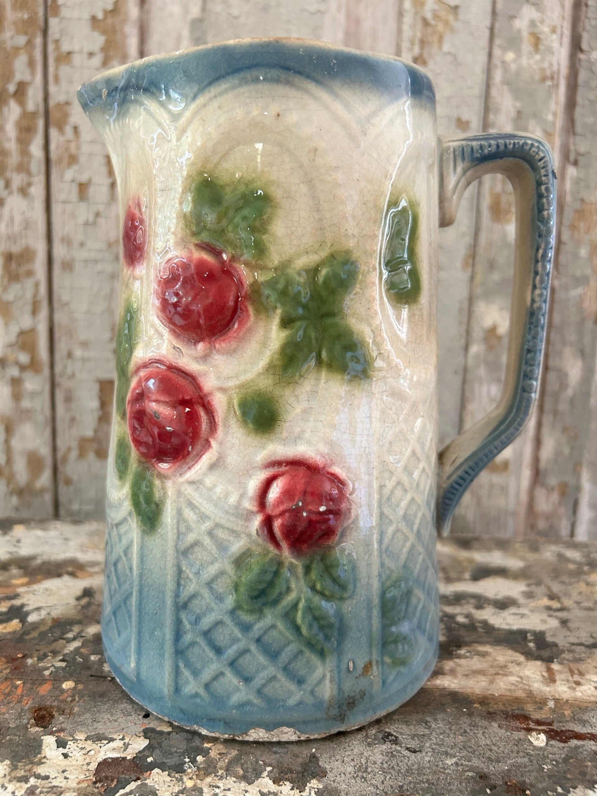 Prachtige, oude waterkan uit Frankrijk met een rijk doorleefd karakter. De kan is beboterd van binnen en versierd met geglazuurde bloemen in diep blauw en bordeauxrood. Hier en daar sleets, met een haarscheurtje – juist dat maakt dit stuk zo uniek en vol leven.