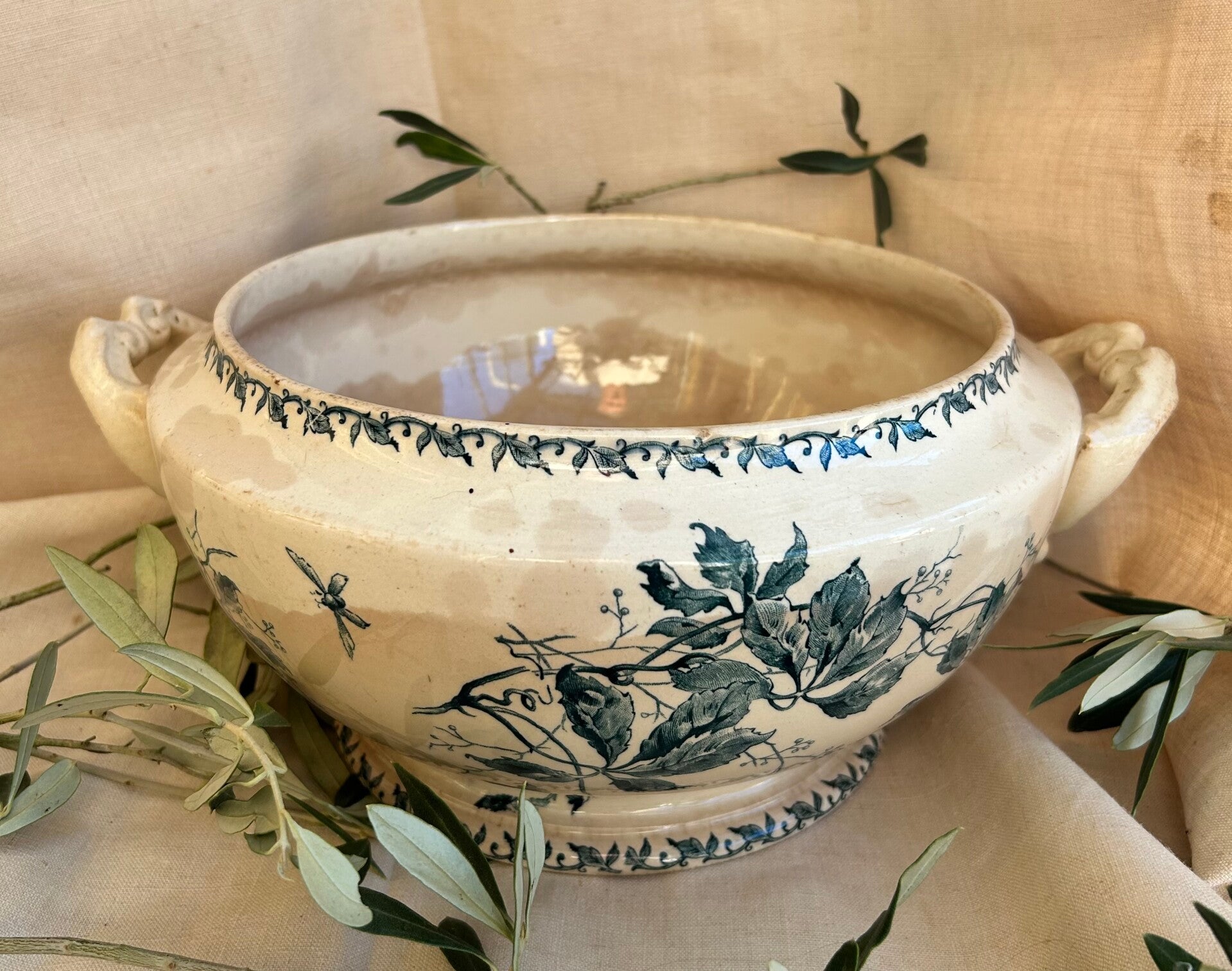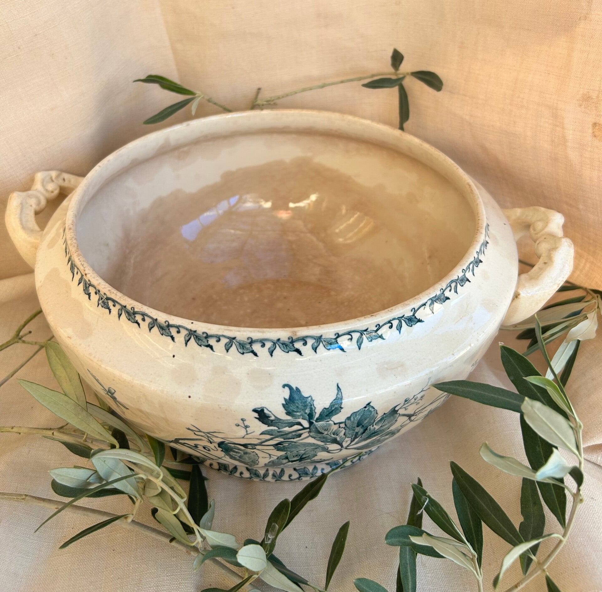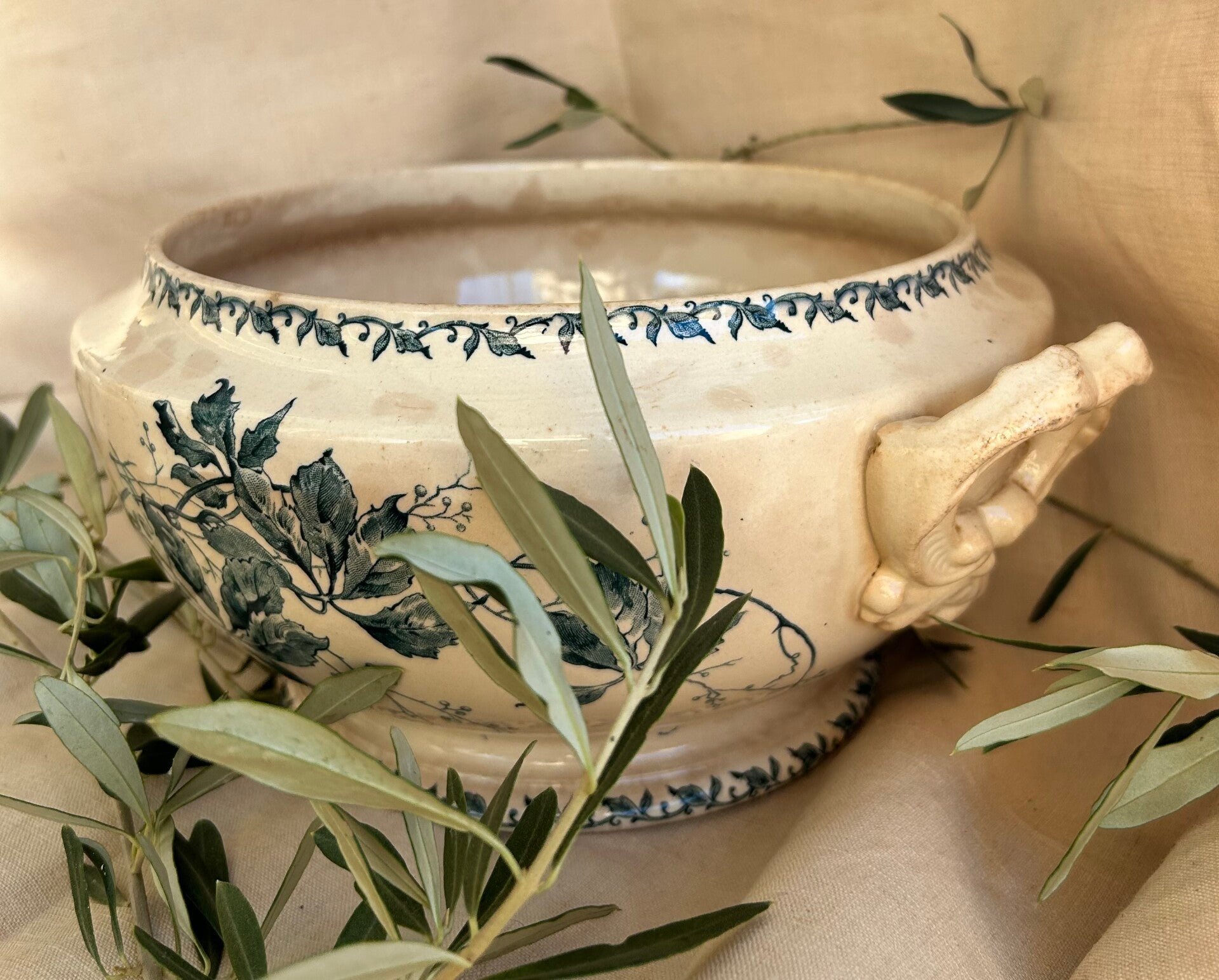 Prachtige vintage terrine uit Frankrijk, voorzien van een klassiek blauw bloemenmotief en een mooie beboterde glazuurlaag.