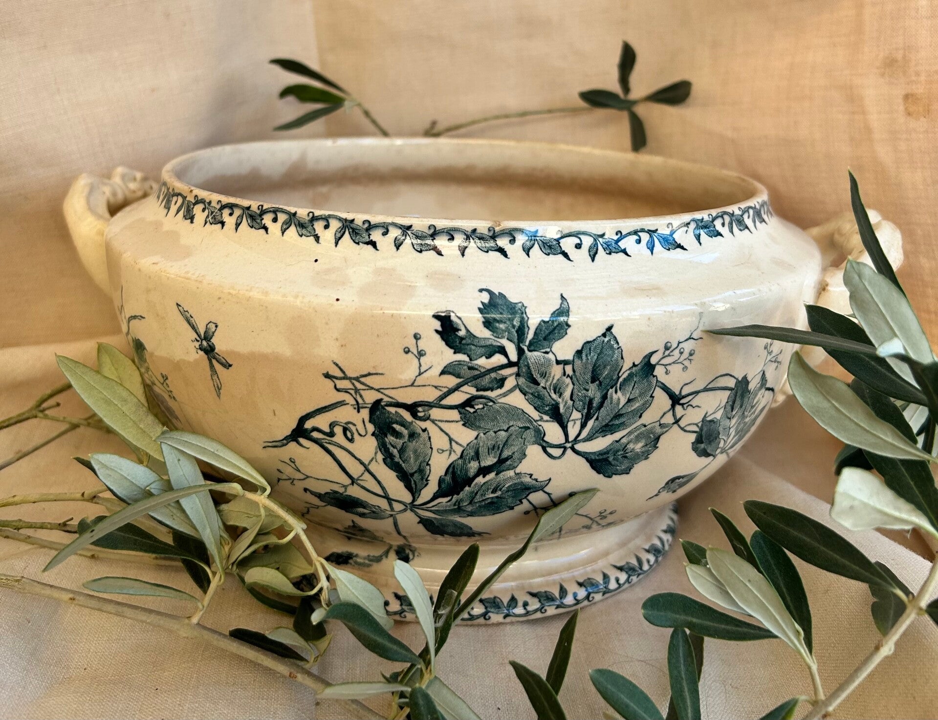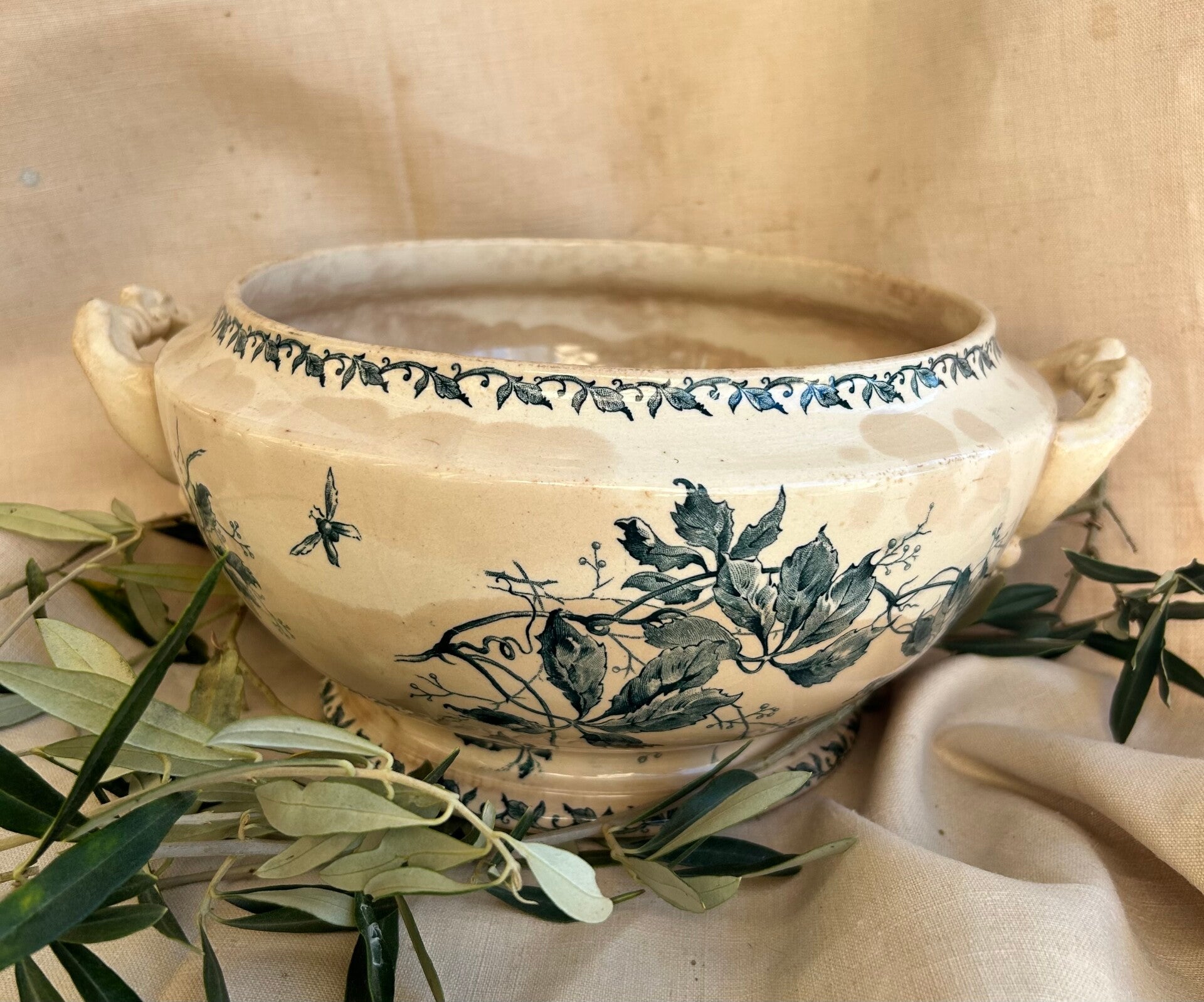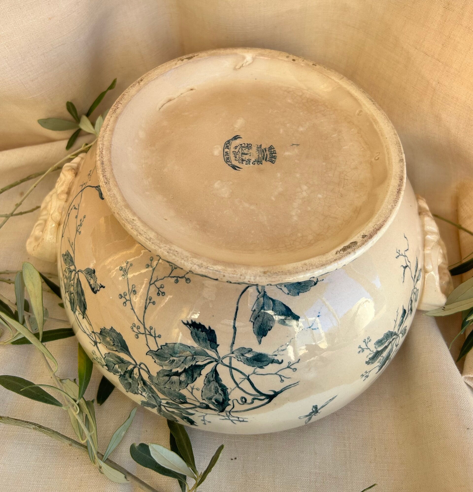 Prachtige vintage terrine uit Frankrijk, voorzien van een klassiek blauw bloemenmotief en een mooie beboterde glazuurlaag.