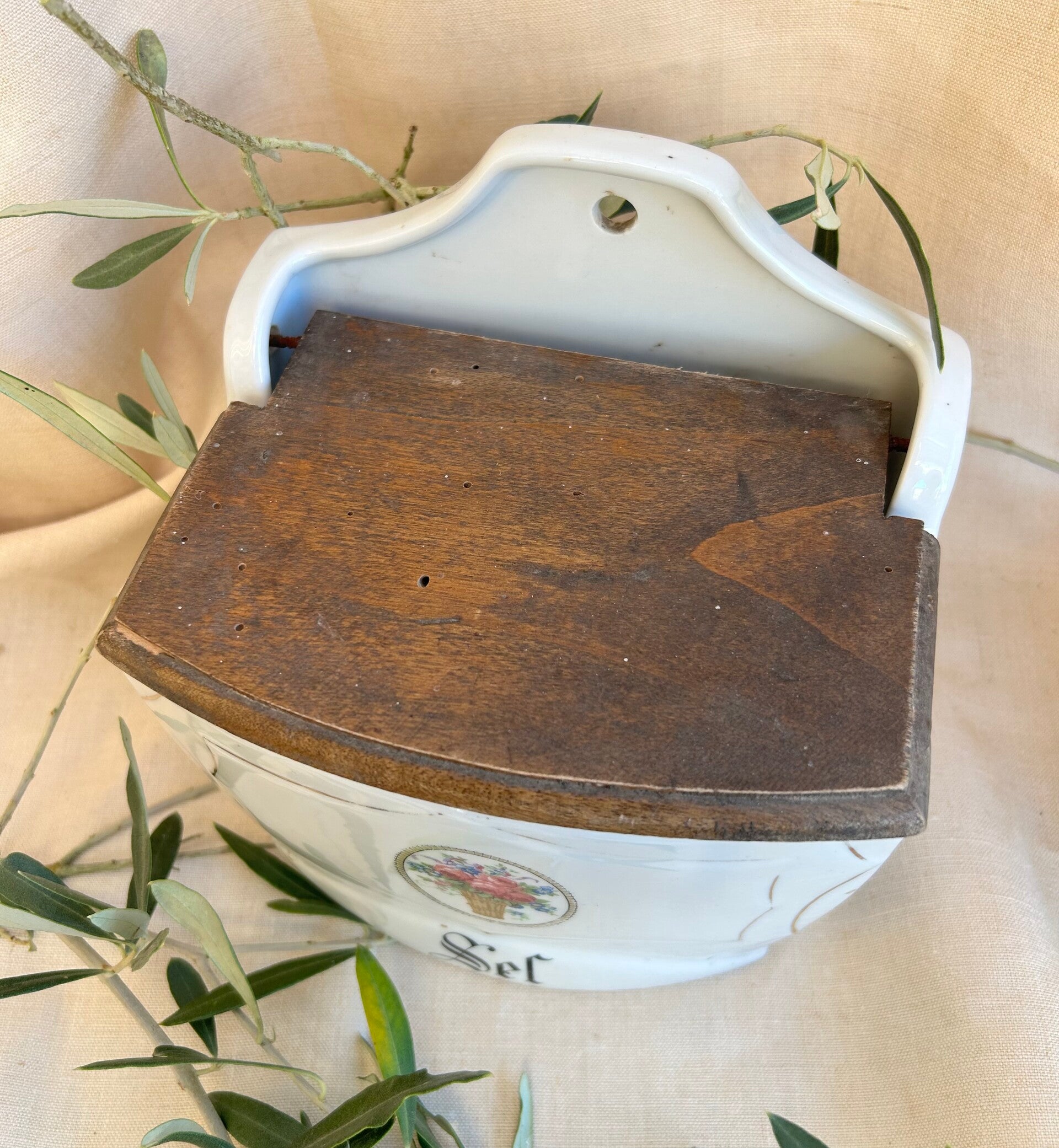 Authentieke Franse sel pot met karakter en charme. Oorspronkelijk gebruikt om zout droog en binnen handbereik te bewaren in de keuken. Een prachtig decoratief stuk dat sfeer brengt in elk interieur – van landelijke keuken tot brocante verzameling.