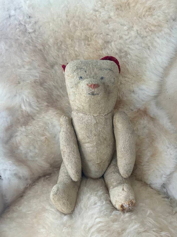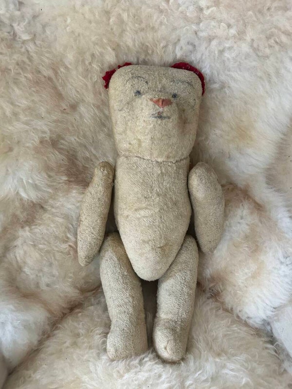 Charmante vintage teddybeer met rode oortjes en getekende oogjes. Deze lieve beer heeft een warme, vriendelijke uitstraling en draagt duidelijk zijn ouderdom met karakter.