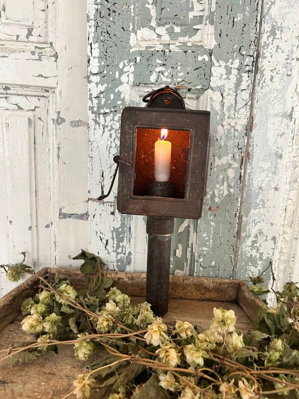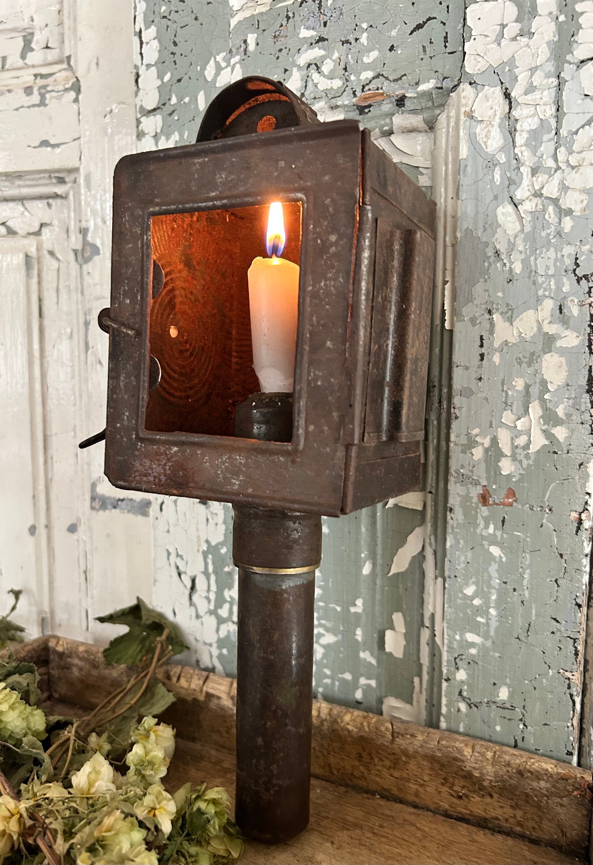 Oude Franse koetslantaarn met karakter. Het glazen raampje ontbreekt, wat juist bijdraagt aan de authentieke charme. Perfect voor decoratie of als verzamelstuk.