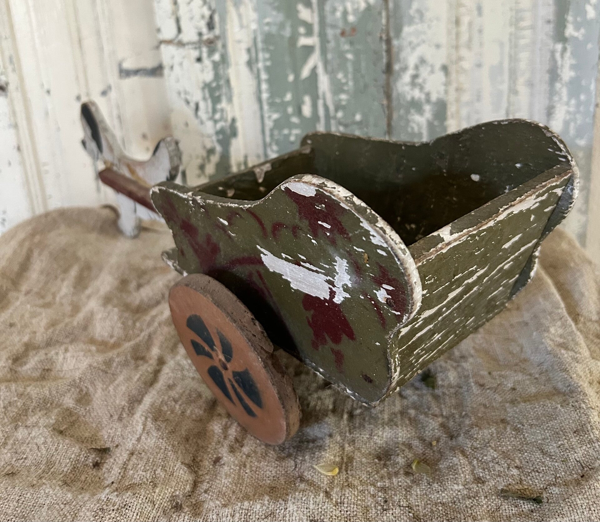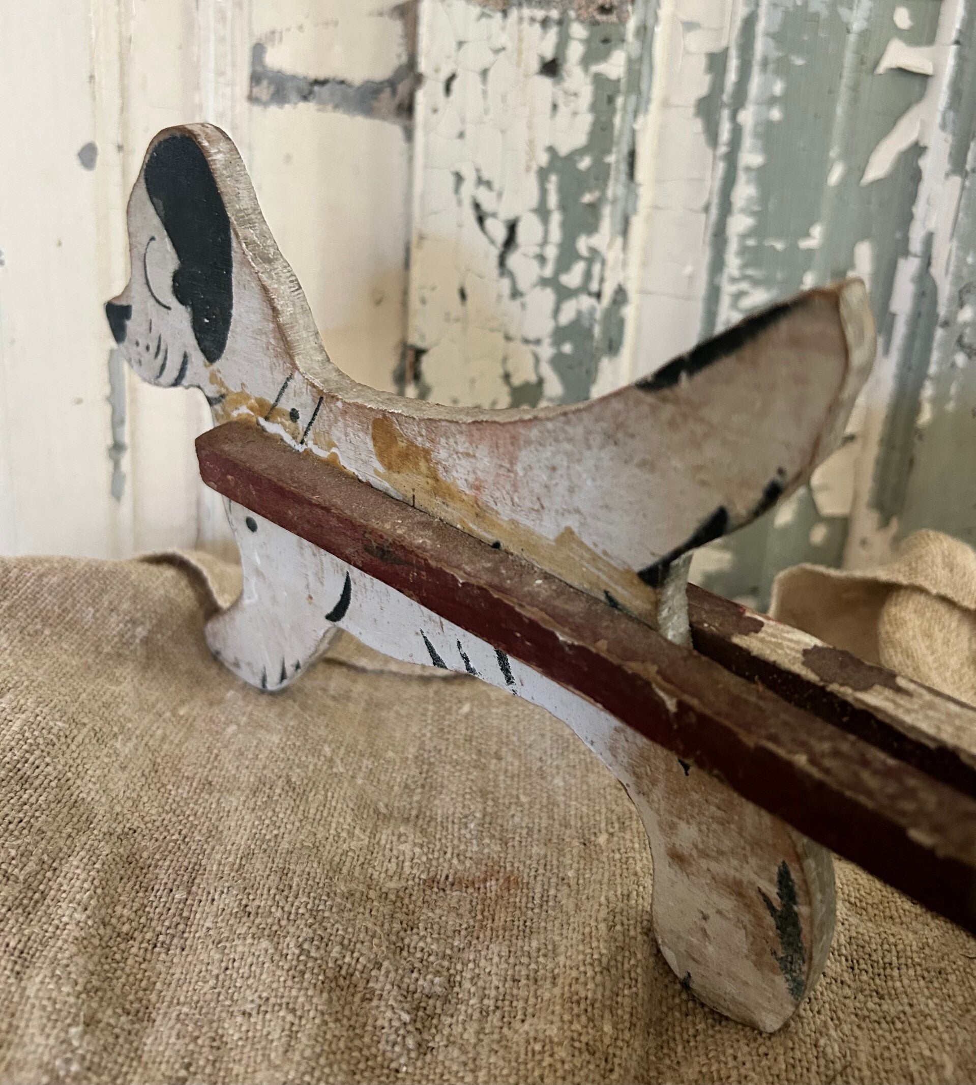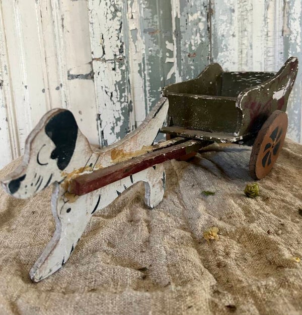 Decoratief houten hondje met trekkarretje, een tijdloos en charmant object voor elk interieur.Afmetingen: 46 × 17 × 14 cm.