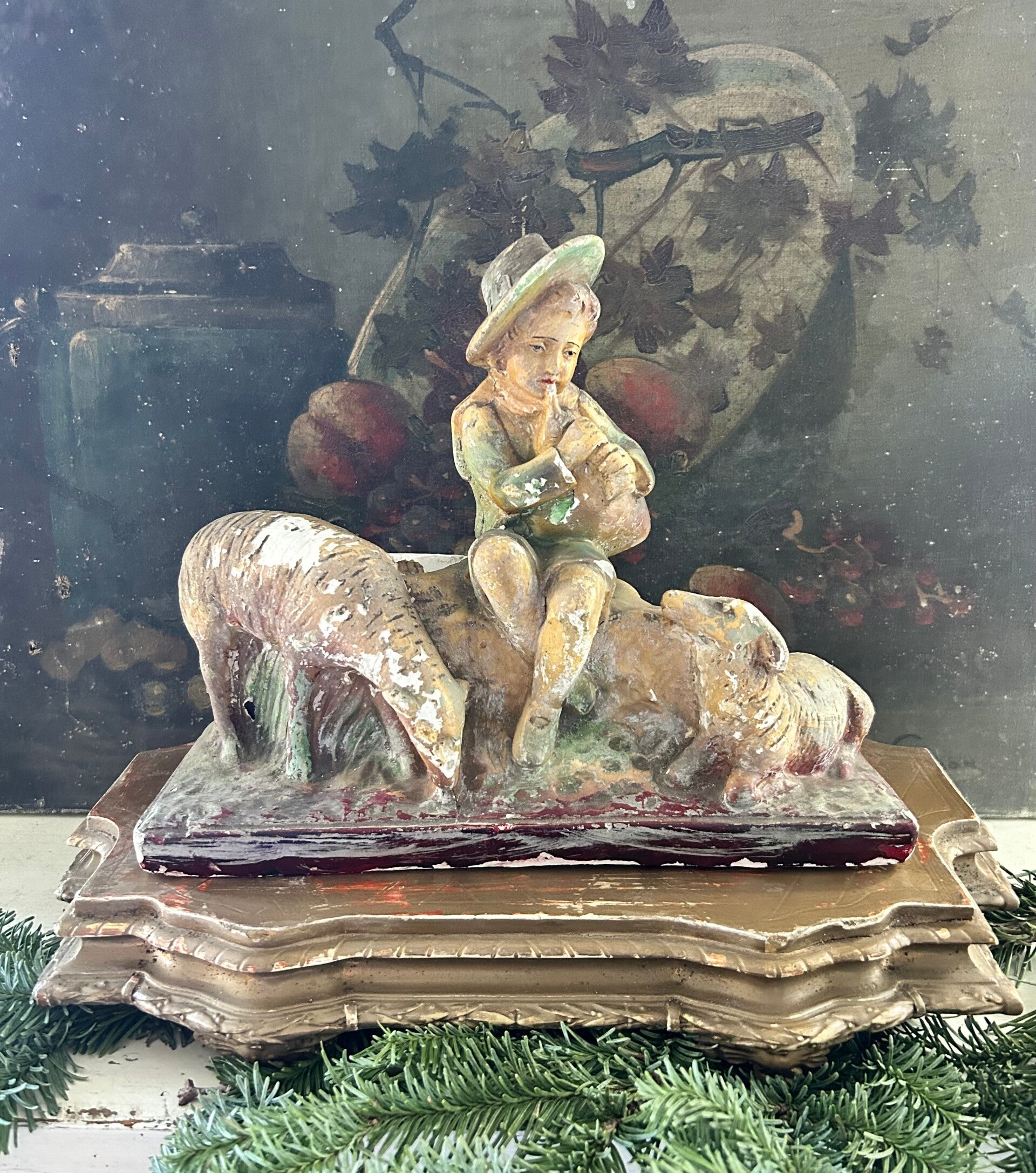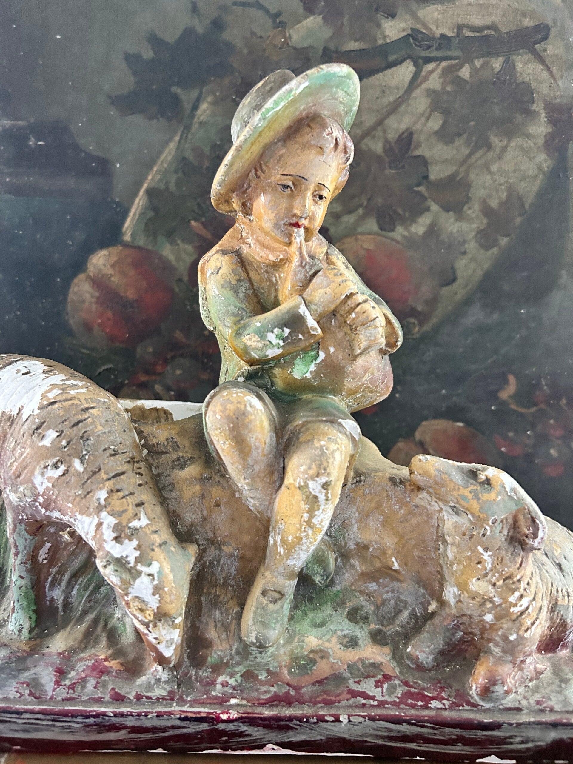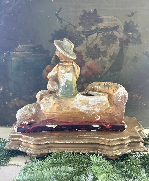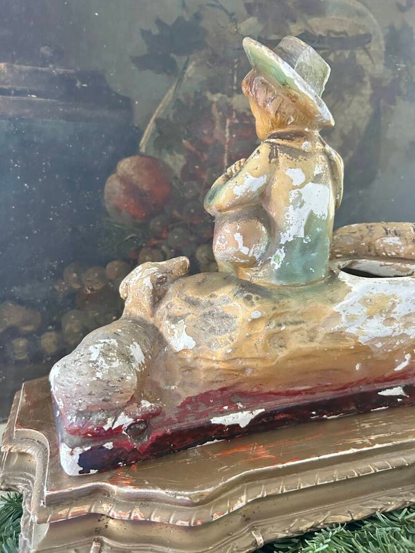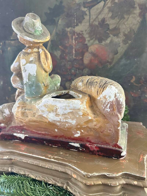Een betoverend Frans herdertje van gips, vergezeld door twee trouwe hondjes. Het beeld heeft die heerlijke, sleetse patina waar liefhebbers zo van houden — zacht verweerd, warm van kleur en vol karakter. Een uniek decorstuk dat meteen sfeer brengt op een schouw, in een kast of tussen andere brocante vondsten.