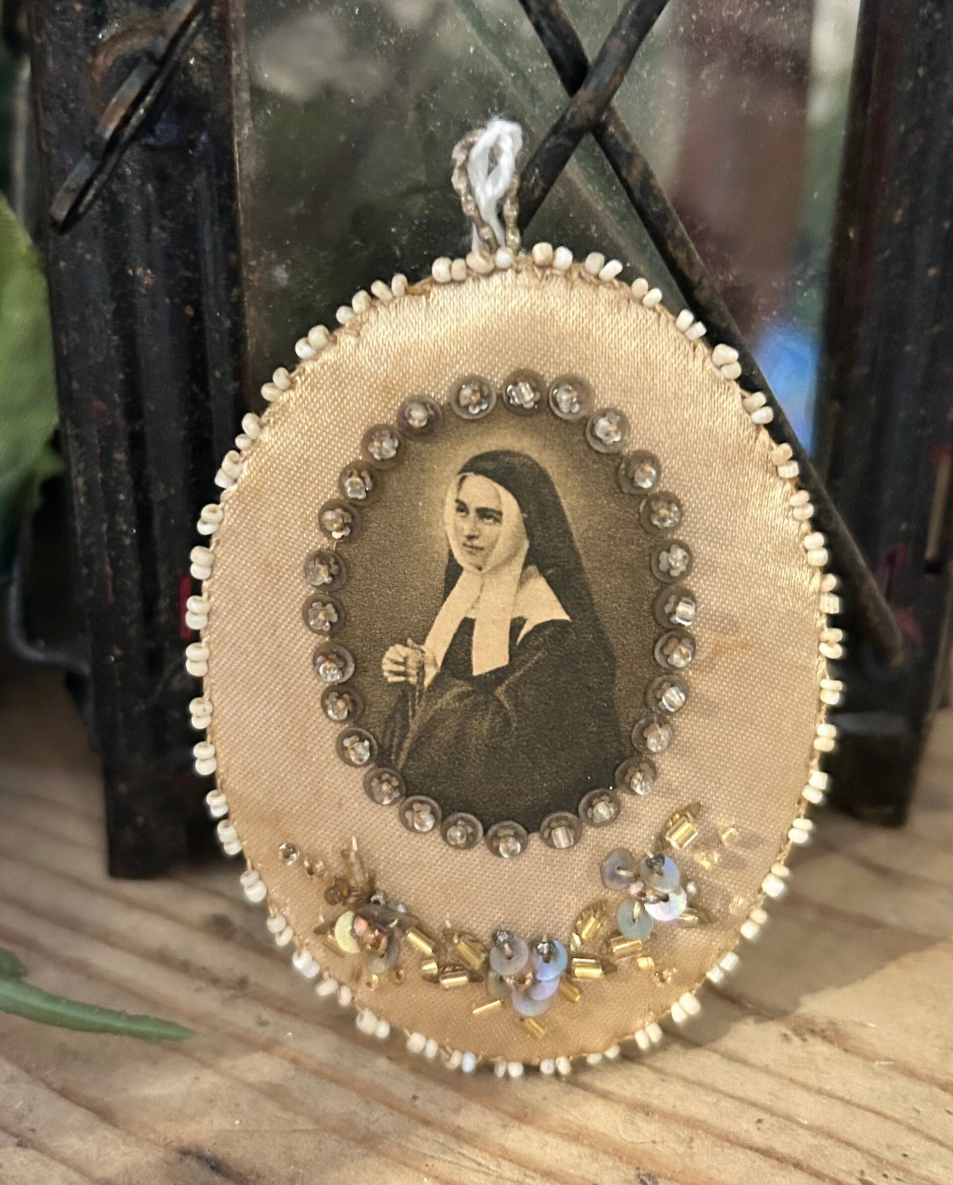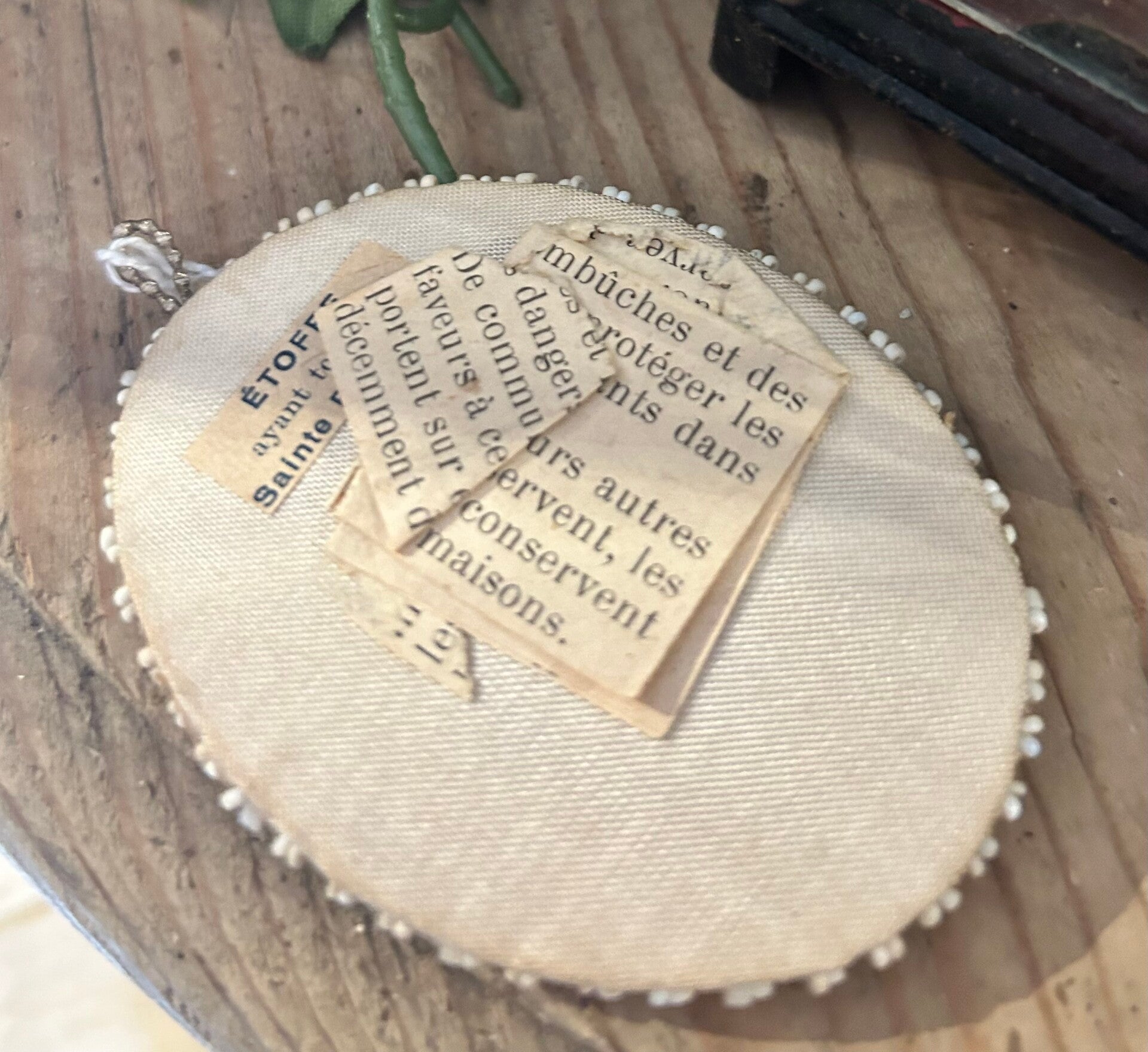 Heel verfijnd medaillon, prachtig afgewerkt met fijne kraaltjes. Het heiligenbeeldje is subtiel en sfeervol, perfect voor in een religieus hoekje, aan een stolp of om neer te leggen in een brocante decoratie.