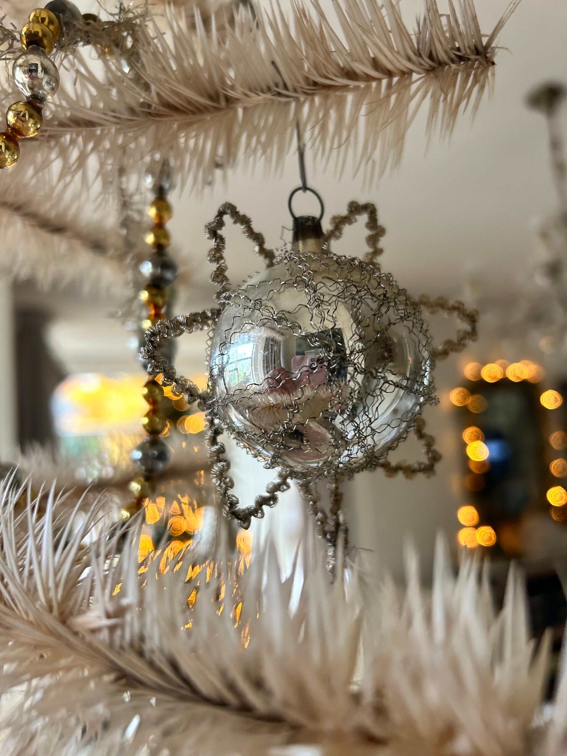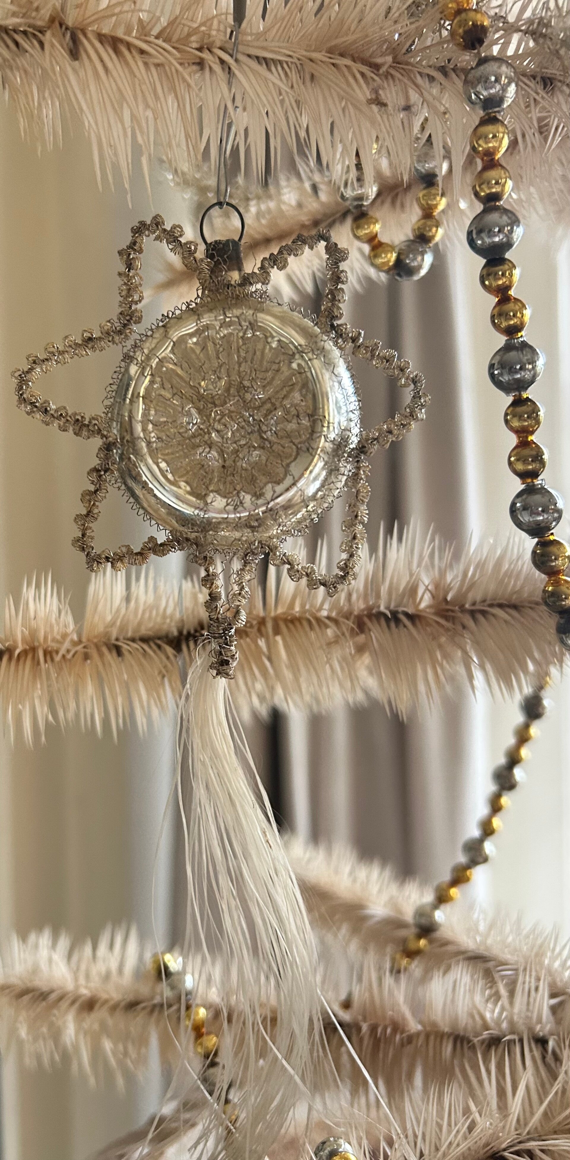 Deze volledig zilverkleurige vintage deukbal is een prachtig stukje kerstnostalgie. Het dunne, oude glas is versierd met een elegante witte ster rondom de deuk, wat het ornament een rustige en stijlvolle uitstraling geeft. Het subtiele tinsel voegt een sprankelend detail toe zonder overheersend te zijn.
