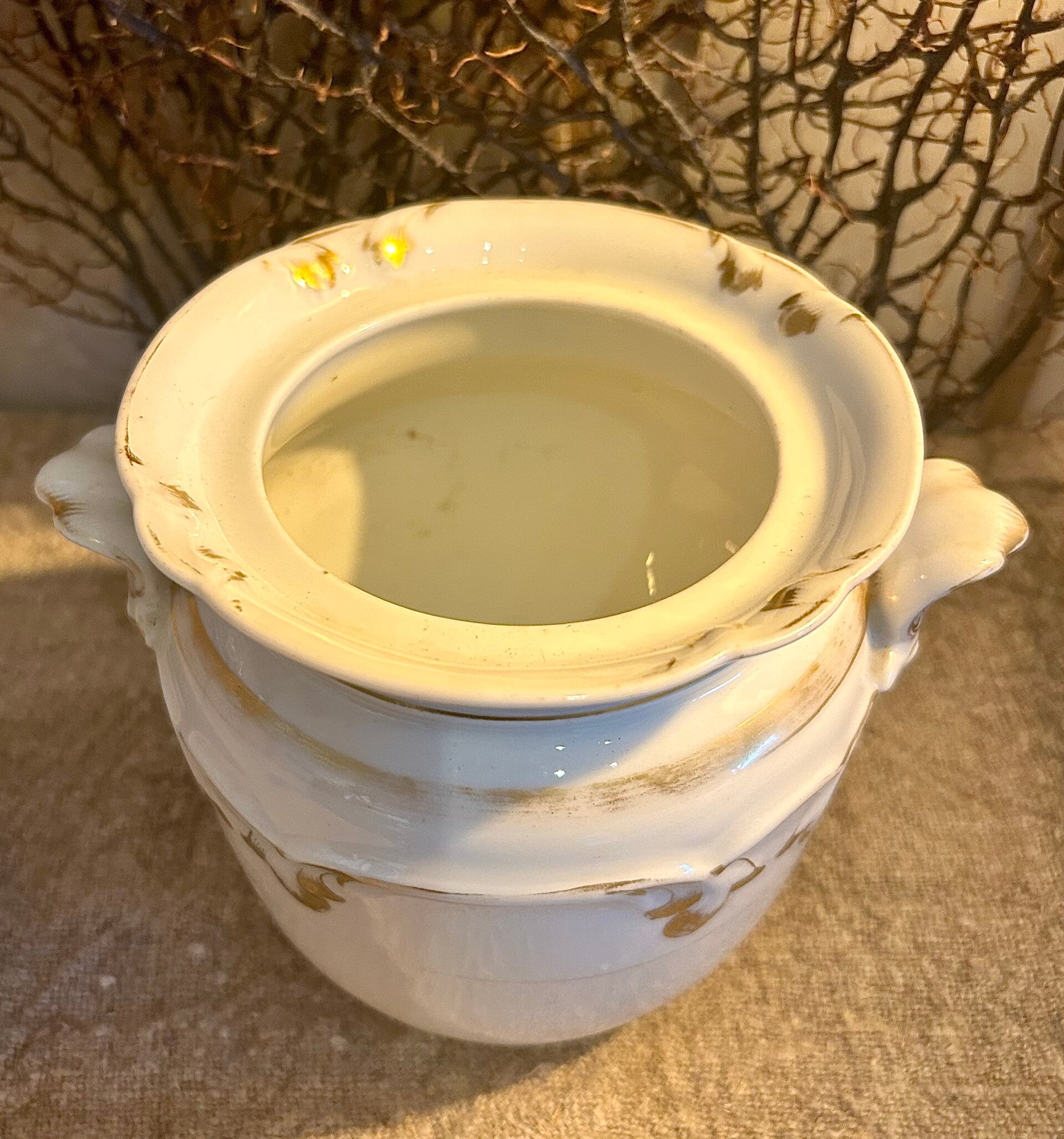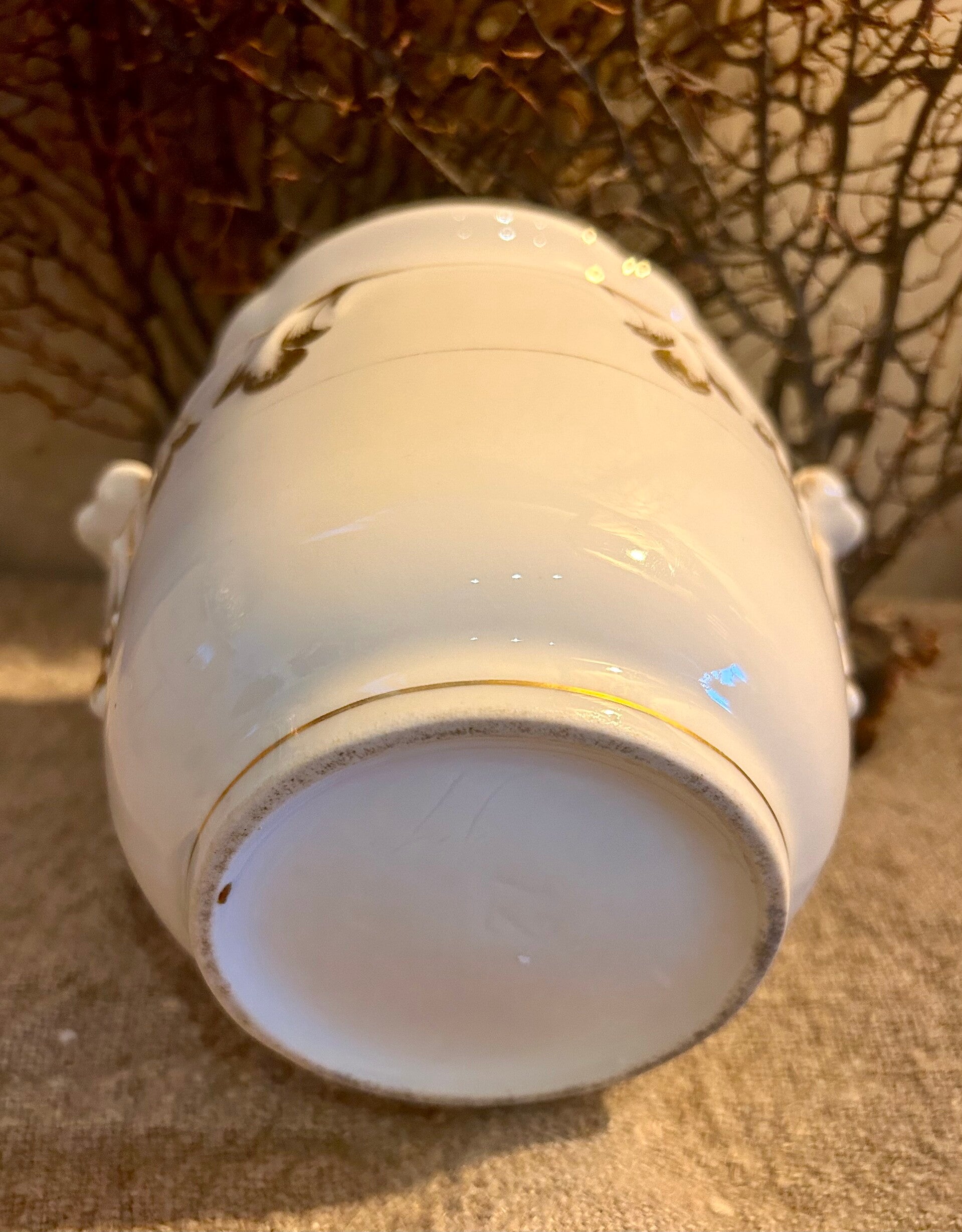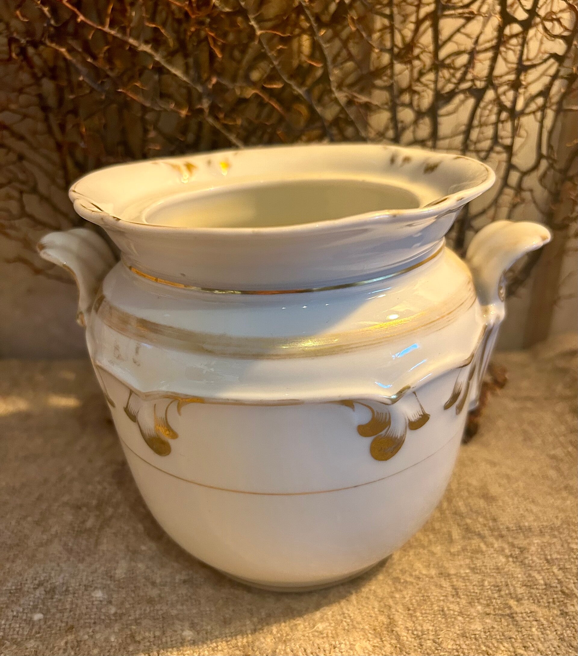 Een charmante porseleinen suikerpot afkomstig uit Parijs, met een verfijnde vorm en een elegante Franse uitstraling. Het porselein heeft een tijdloze, romantische look die perfect past in zowel een brocante interieur als een stijlvolle landelijke keuken.