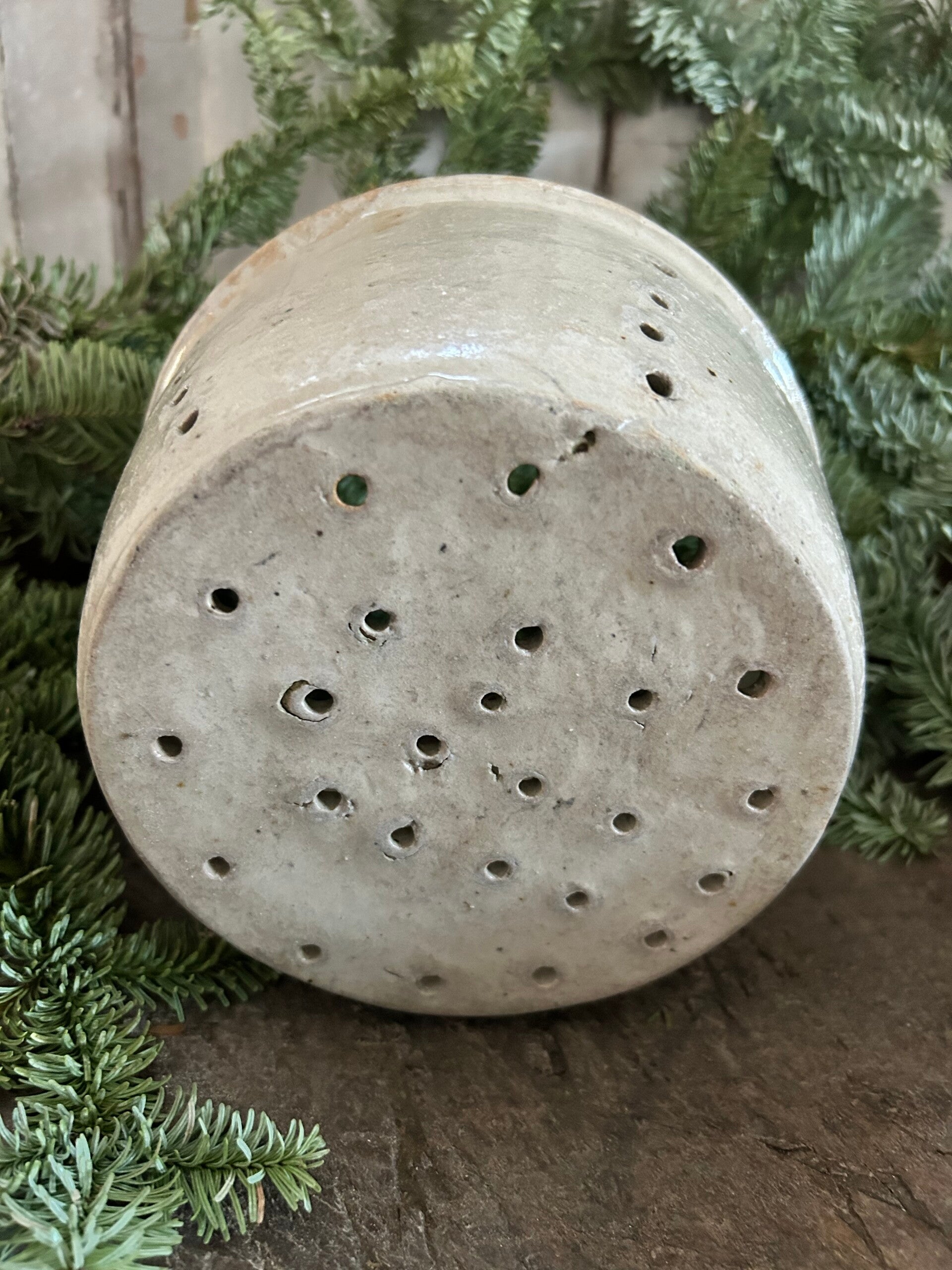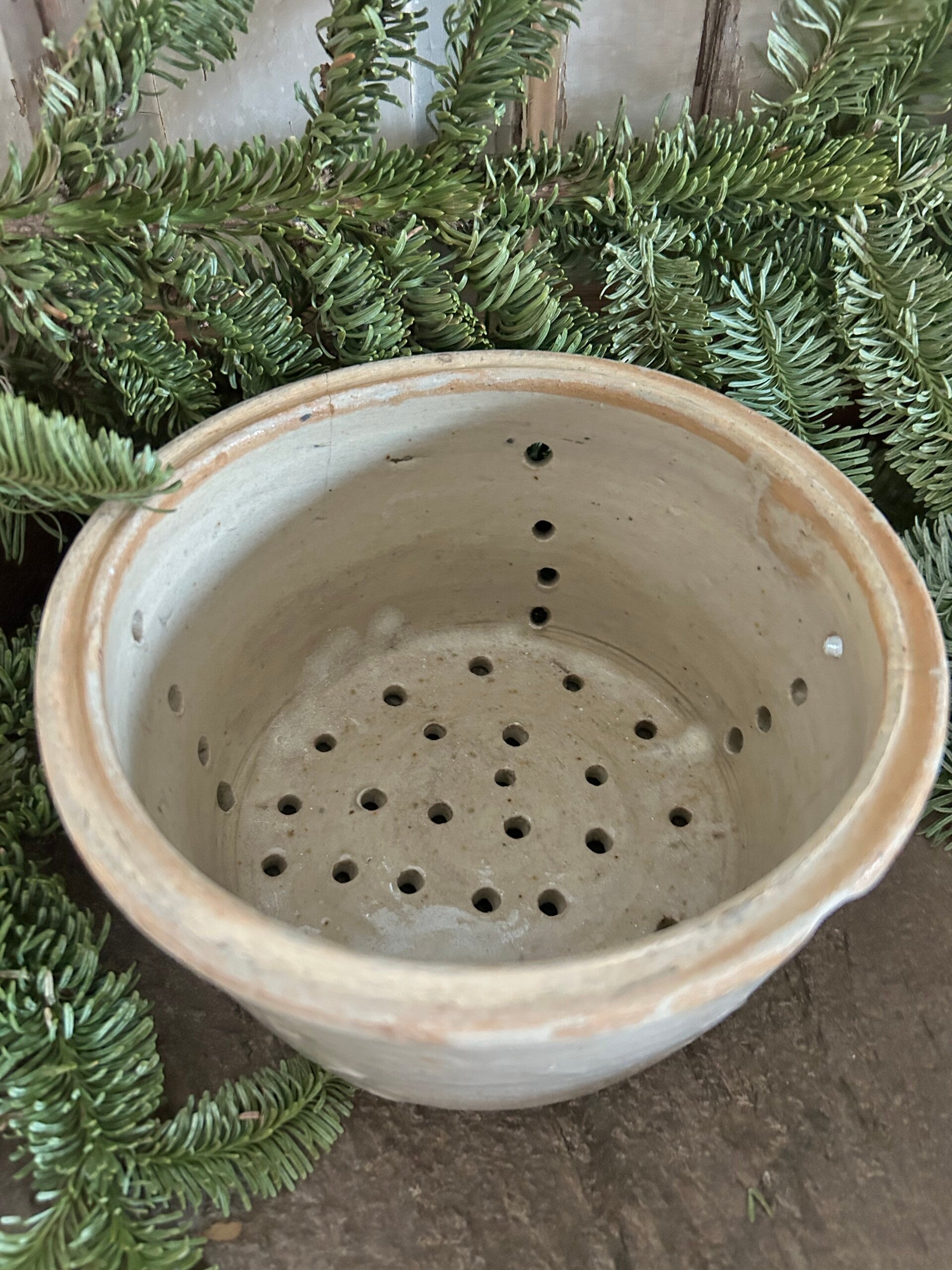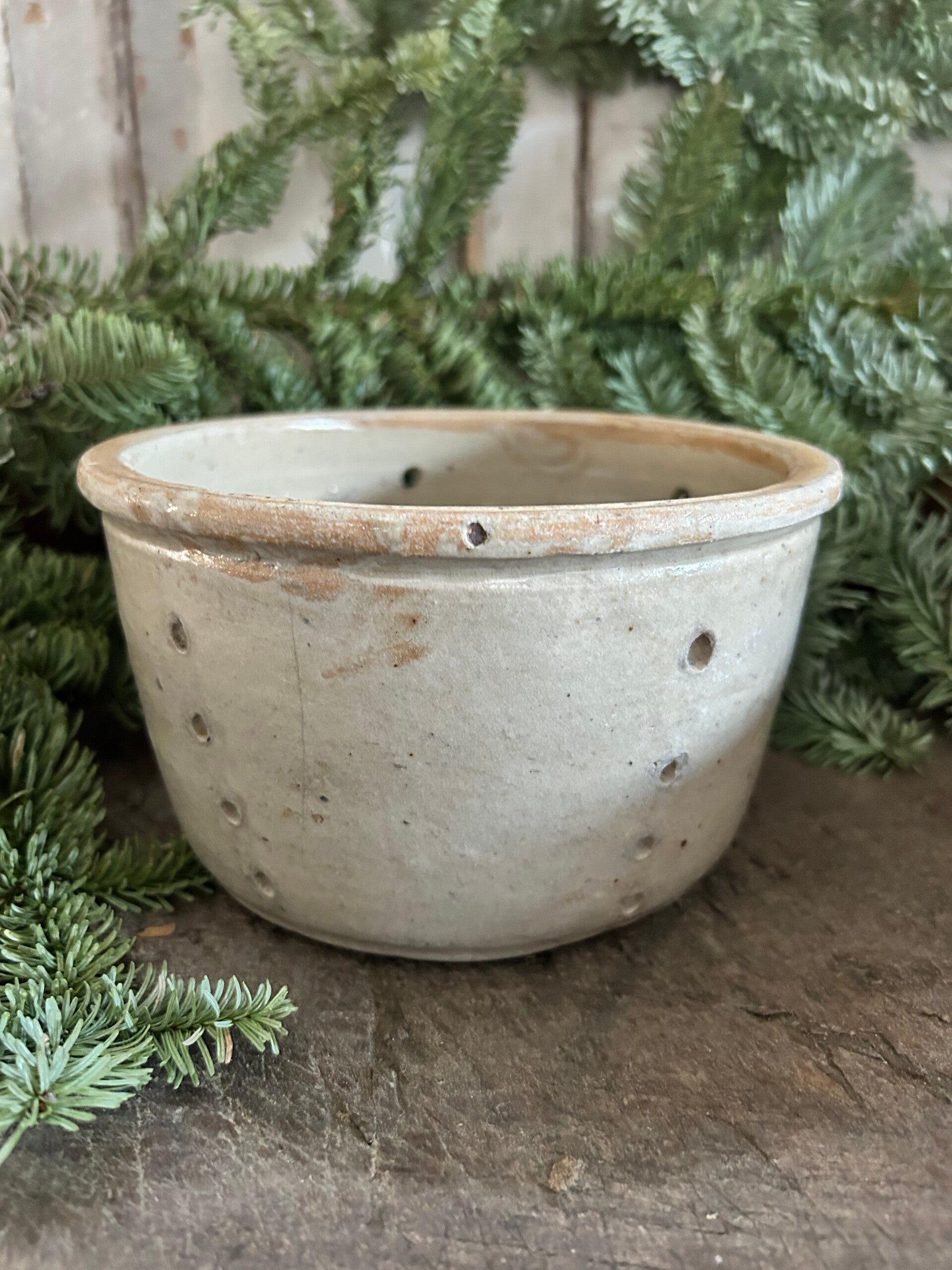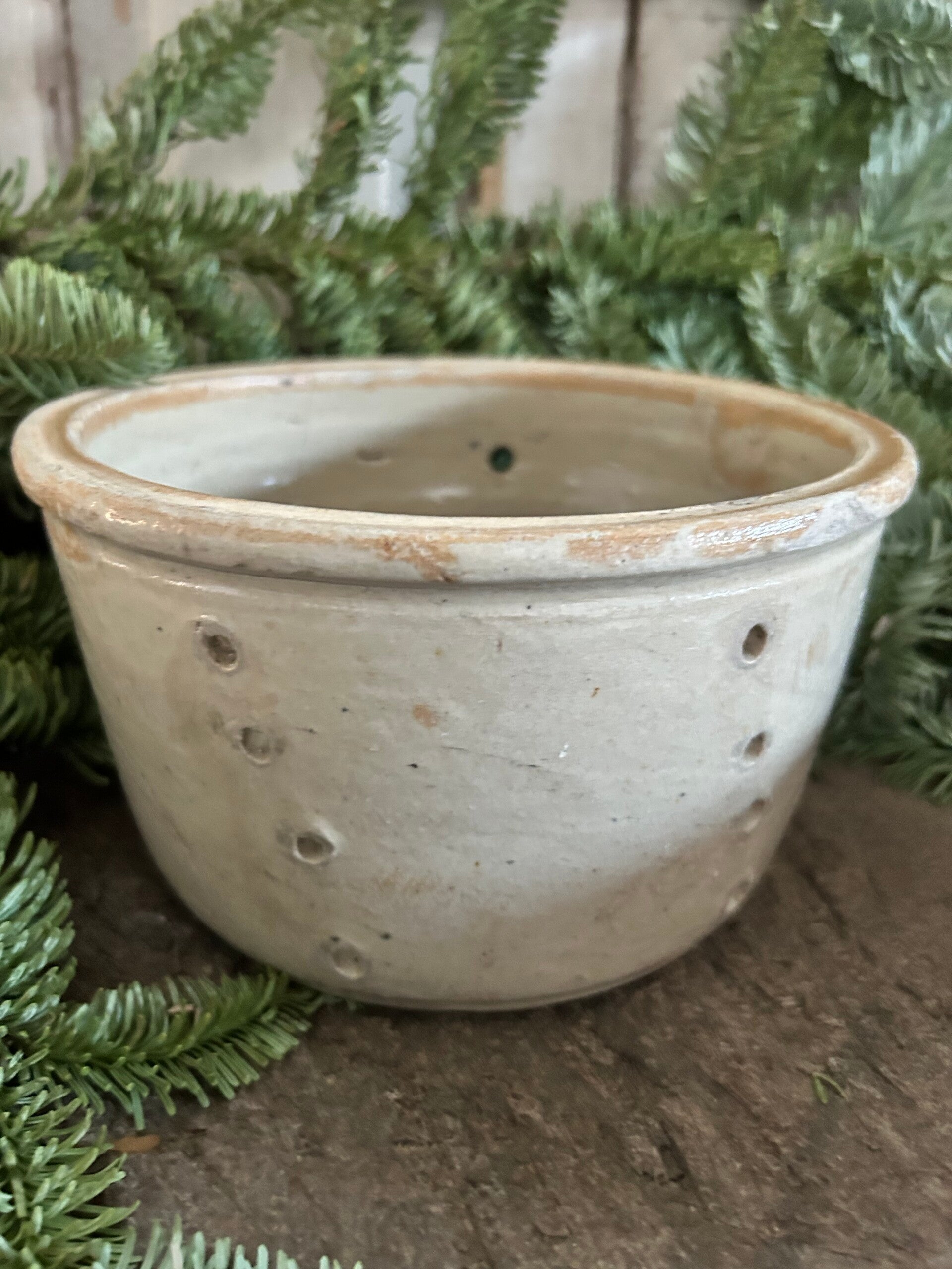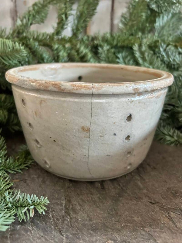 Franse grès lekbak, ooit gebruikt bij het maken van kaas. Nu een prachtig decoratief stuk, bijvoorbeeld met een mooie kaars erin. De bak heeft één haarlijntje, passend bij de leeftijd en charme.