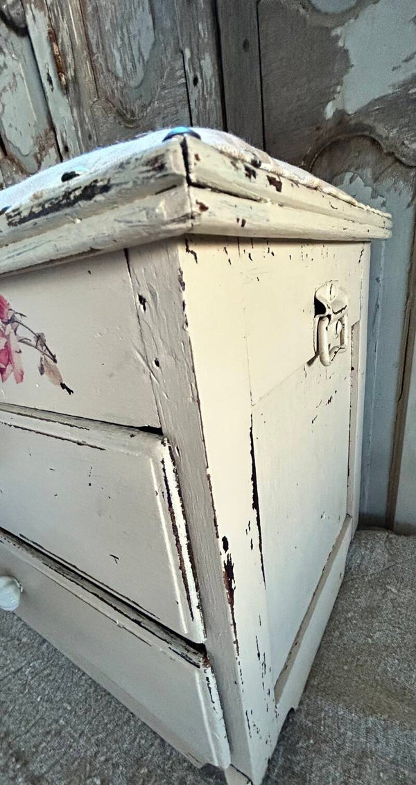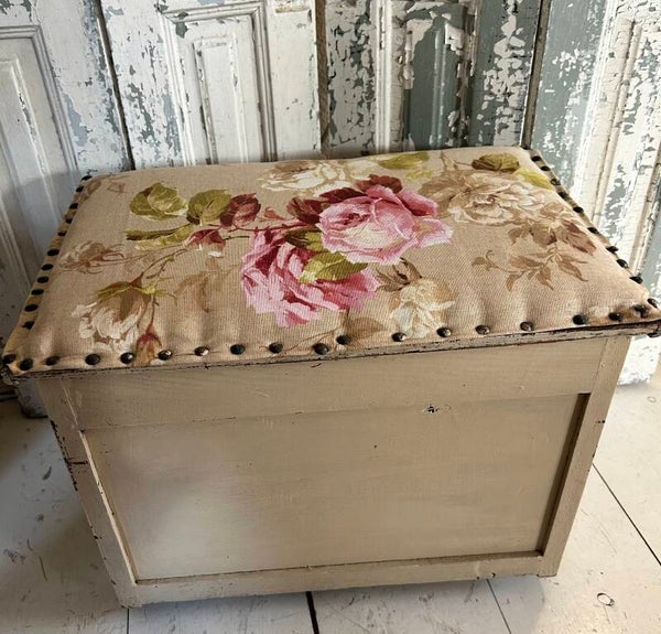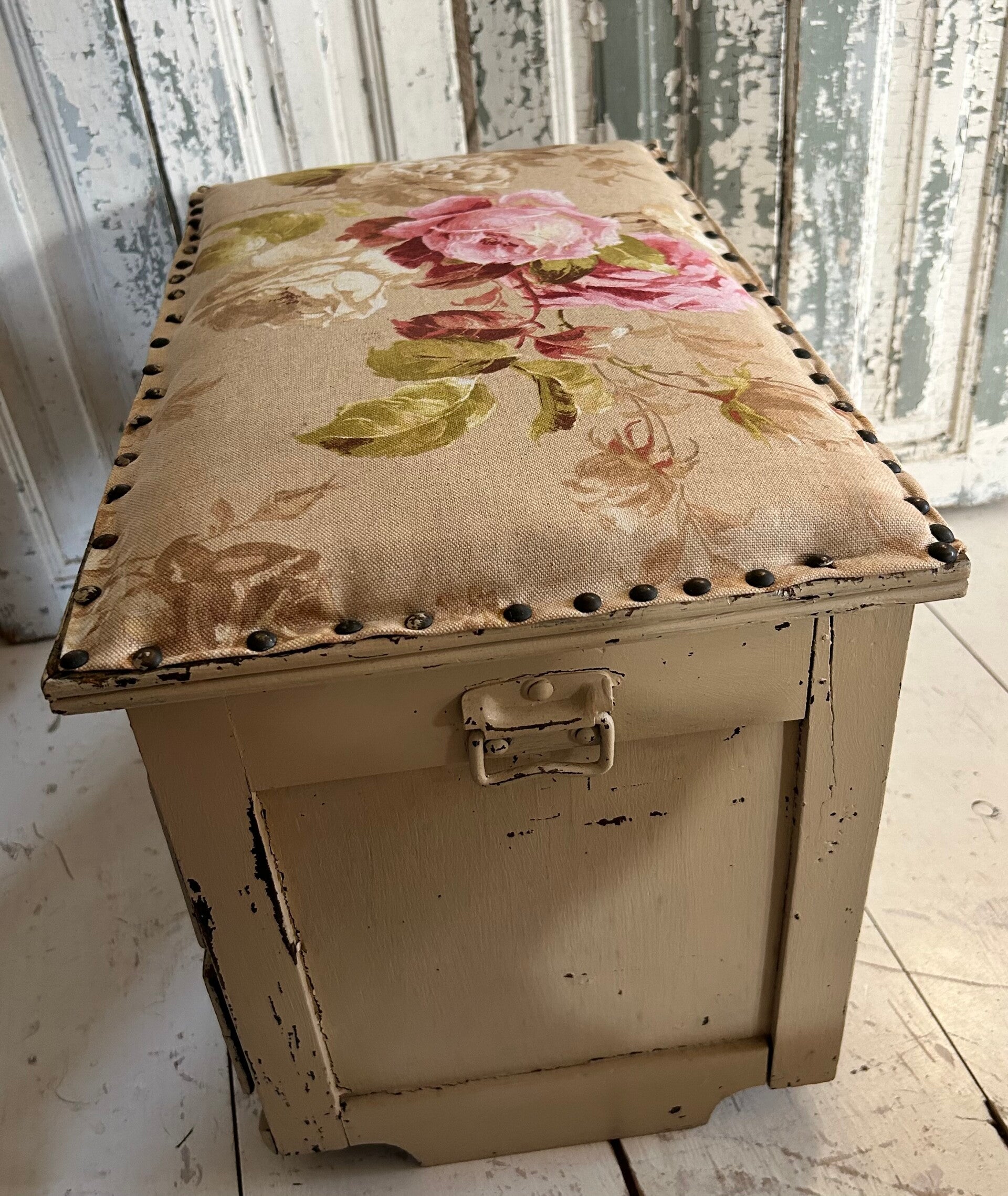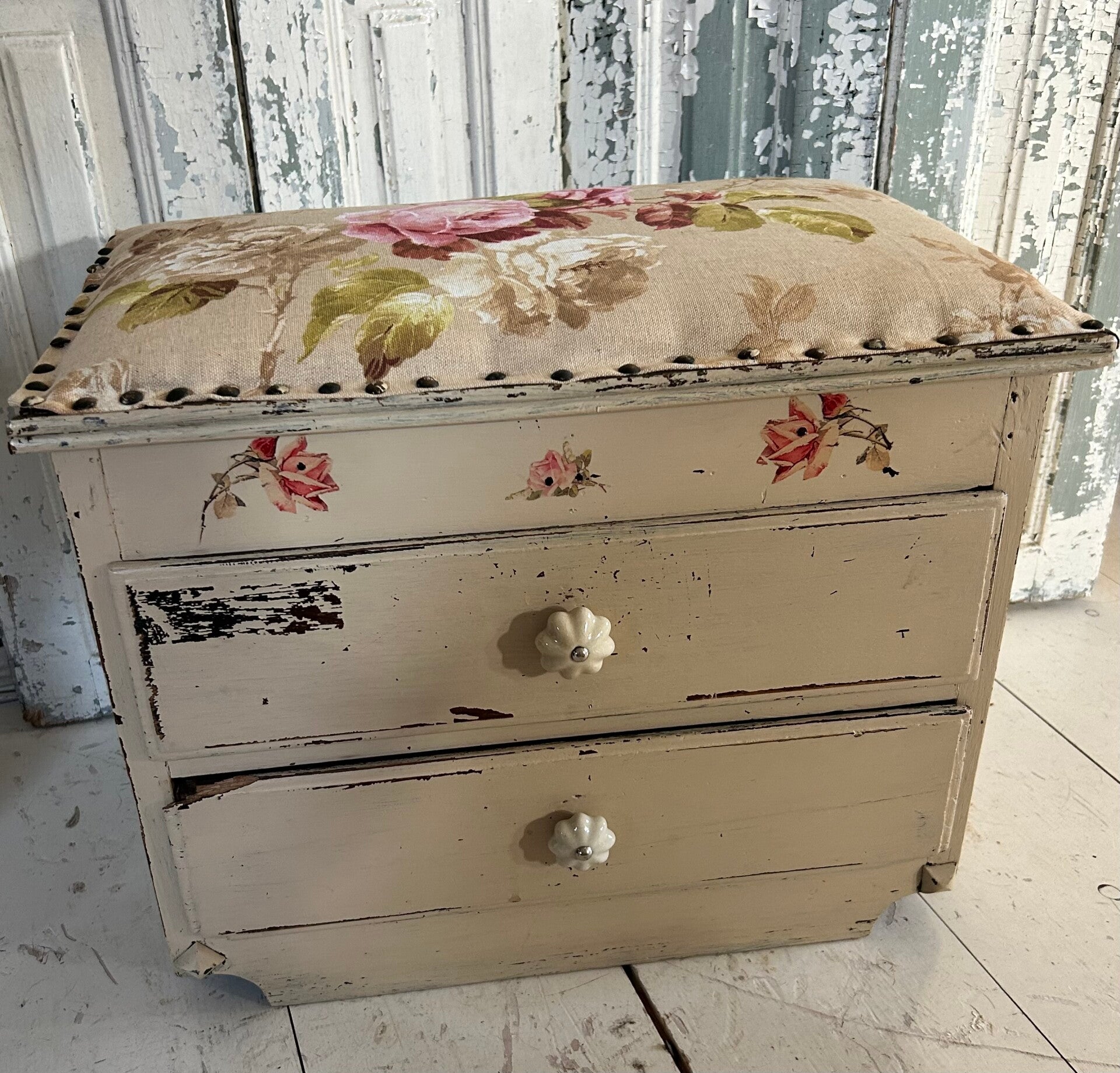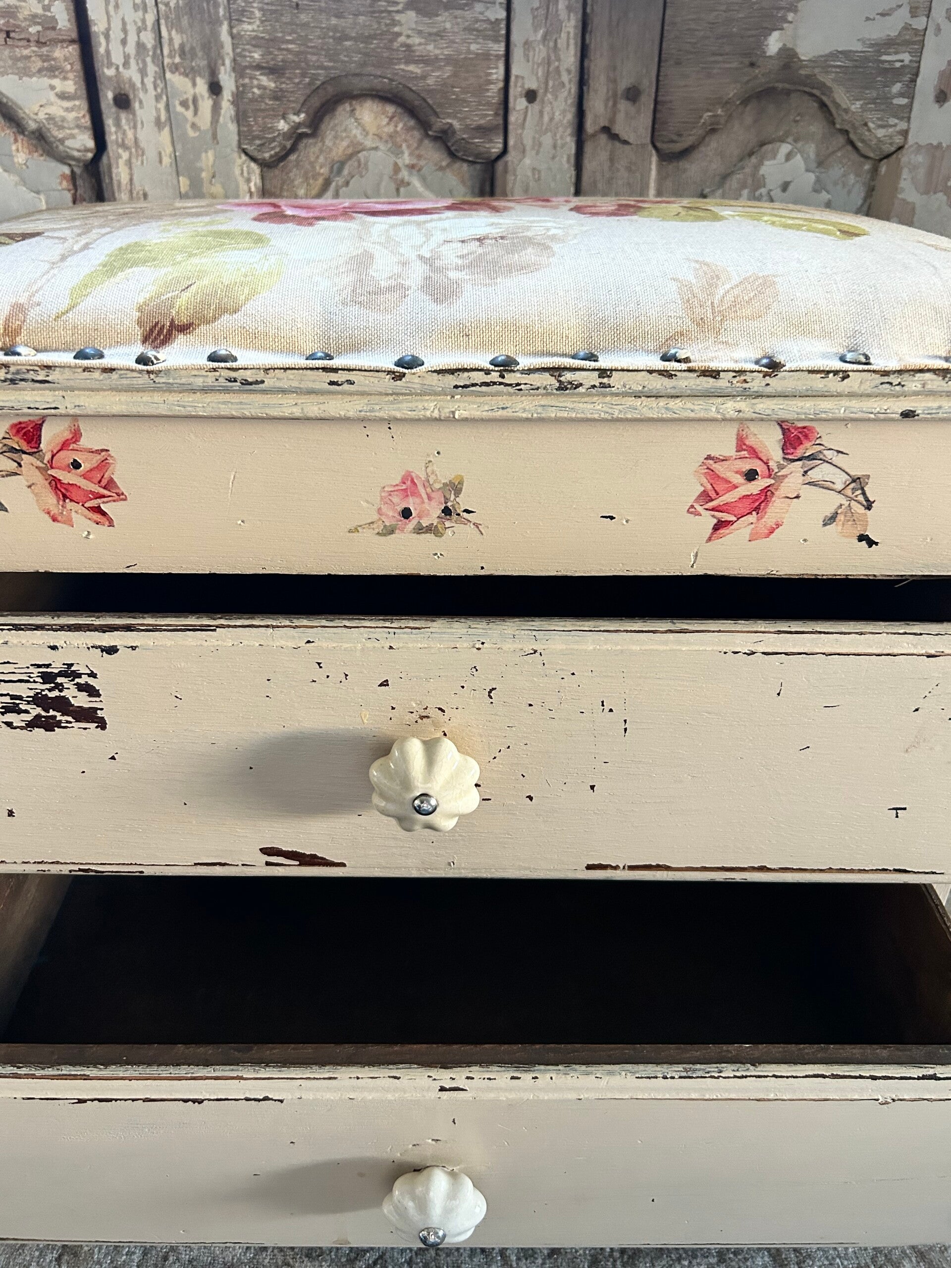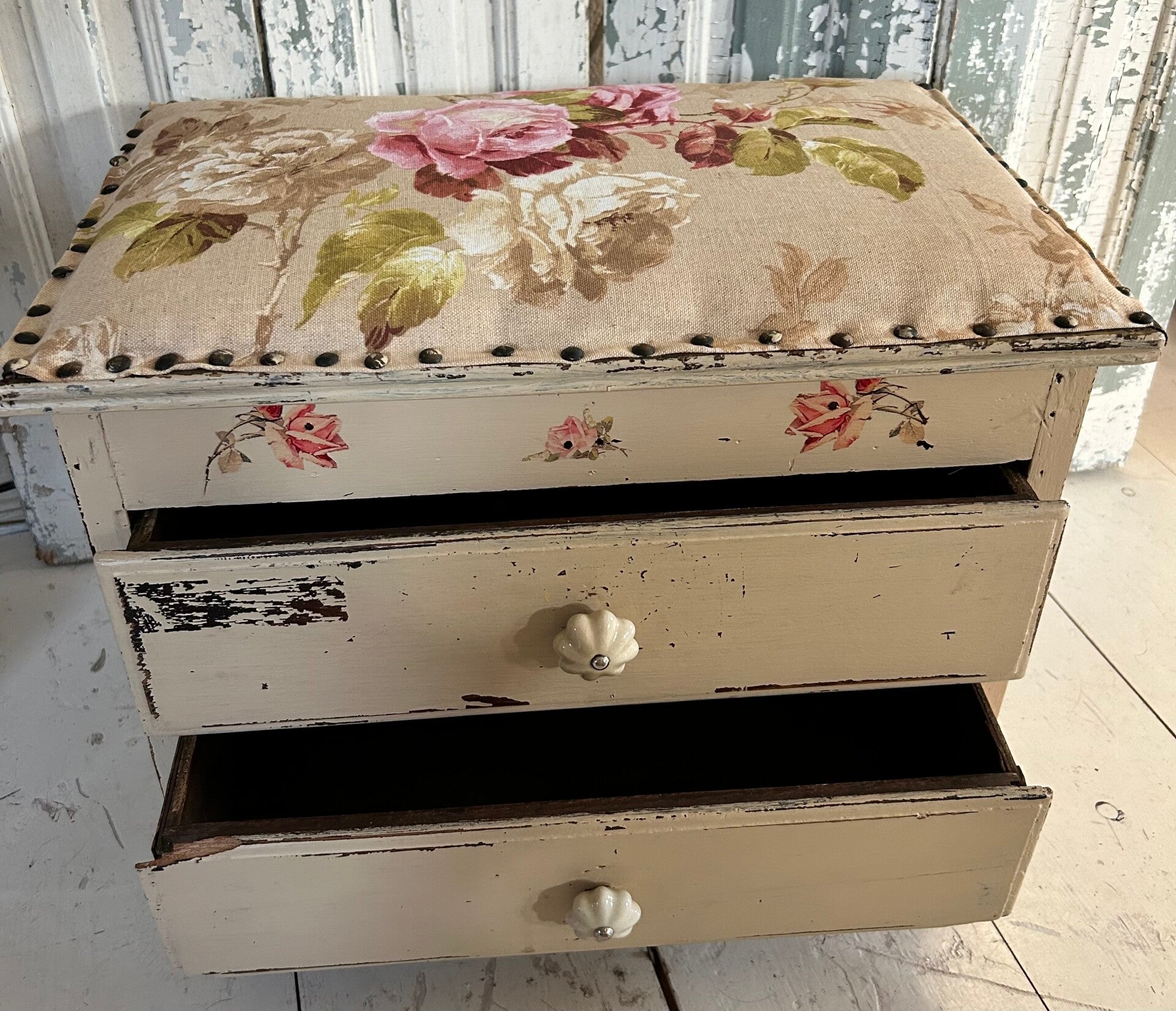 Charmant, sierlijk ladekastje met twee lades en een bovenkant die prachtig is gestoffeerd in een bloemmotief. De zachte beige patina geeft het geheel een warme, romantische uitstraling. Een prachtig decoratief stuk voor slaapkamer, hal of brocantehoek.
