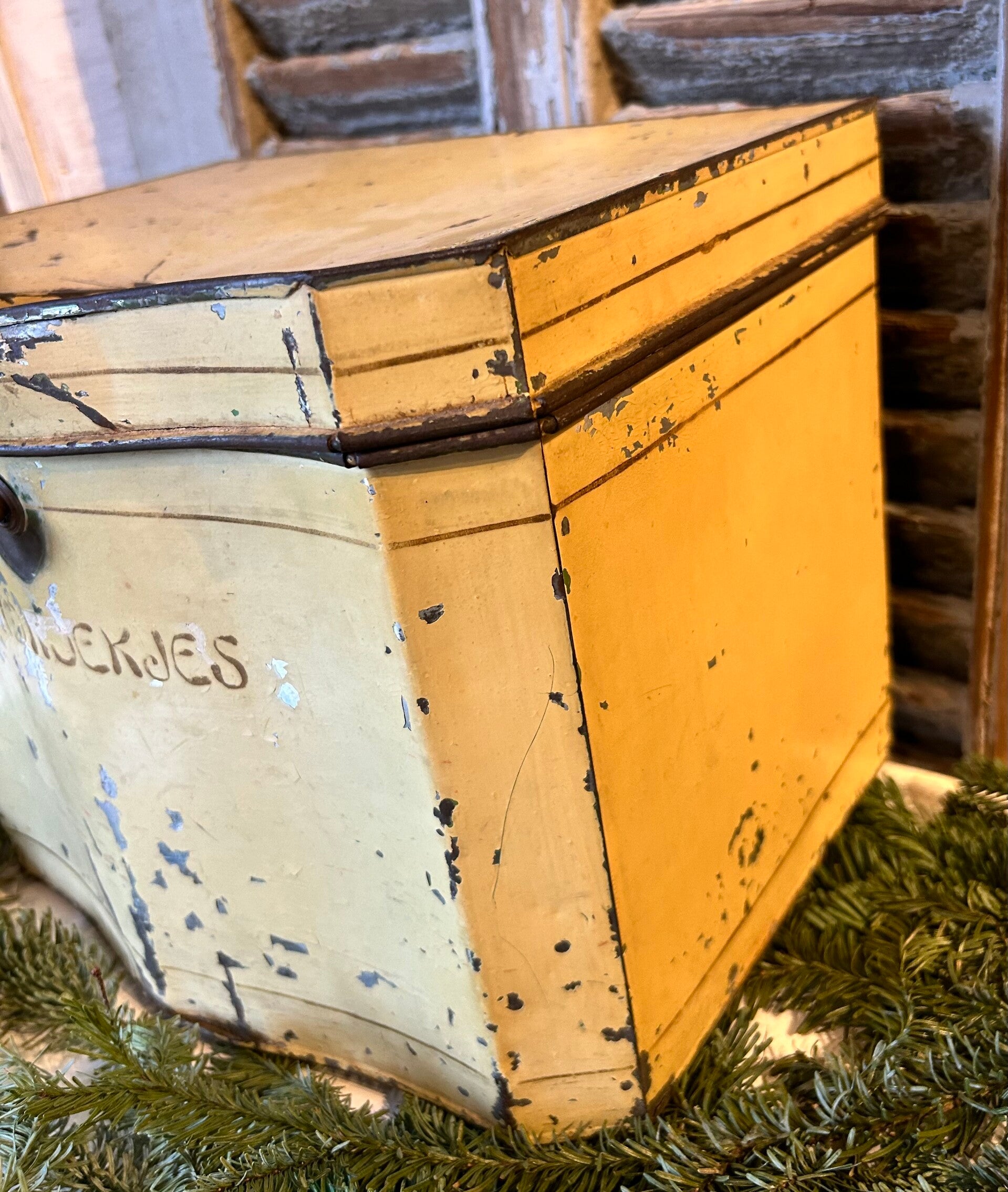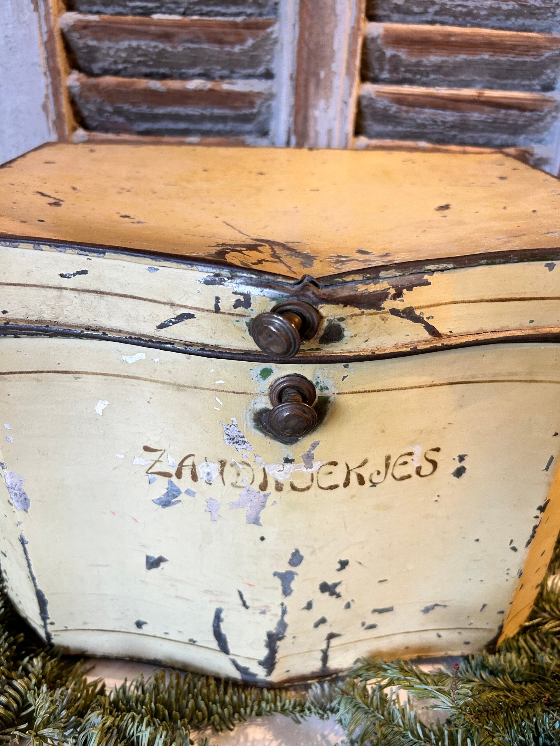 Dit charmante, koekblik heeft een verweerde gele kleur die direct een authentieke, nostalgische sfeer oproept. Aan de voorzijde staat de tekst “ZANDKOEKJES”, uitgevoerd in reliëf of beschilderd, wat het blik een karaktervolle uitstraling geeft.