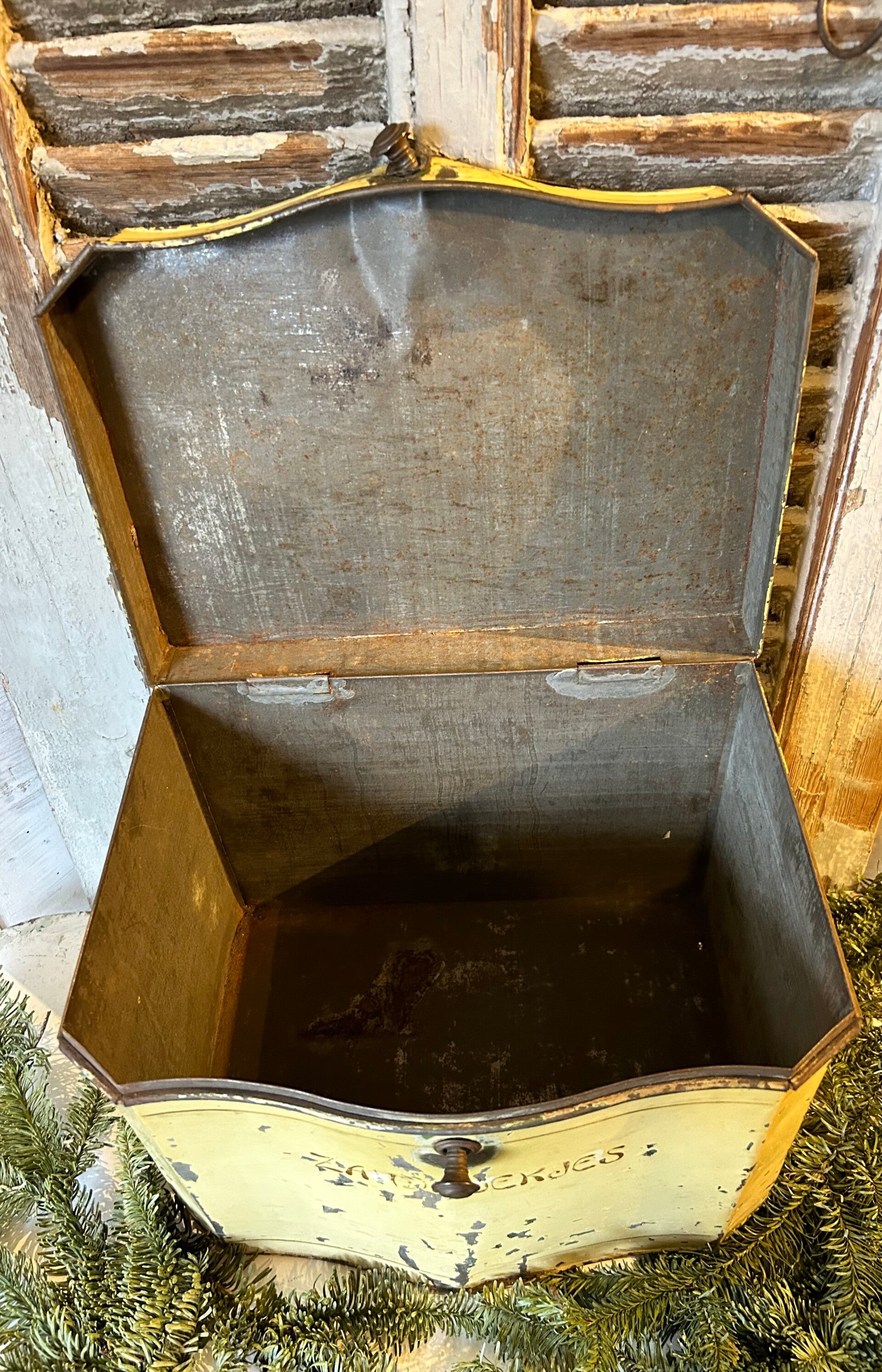 Het blik is voorzien van een metalen sluiting aan de voorkant en vertoont duidelijke sporen van leeftijd en gebruik. Deze gebruikssporen dragen bij aan de antieke uitstraling en maken het blik extra karaktervol. Een sfeervol decoratief object voor liefhebbers van vintage en brocante, maar ook mooi als opberger.