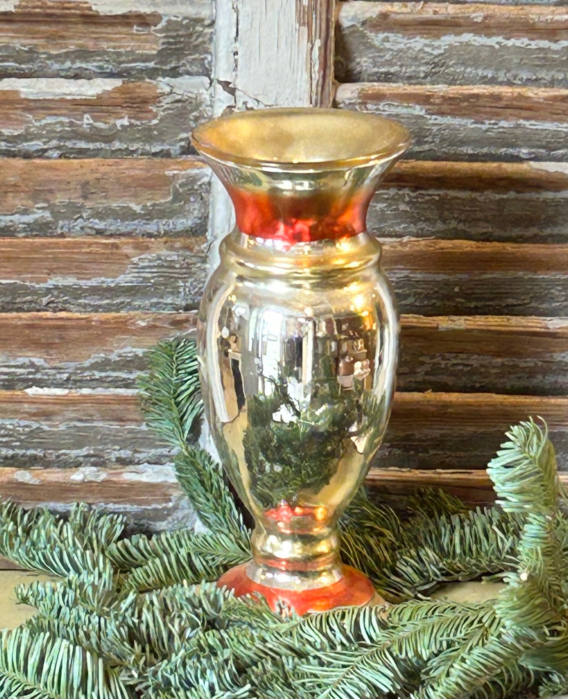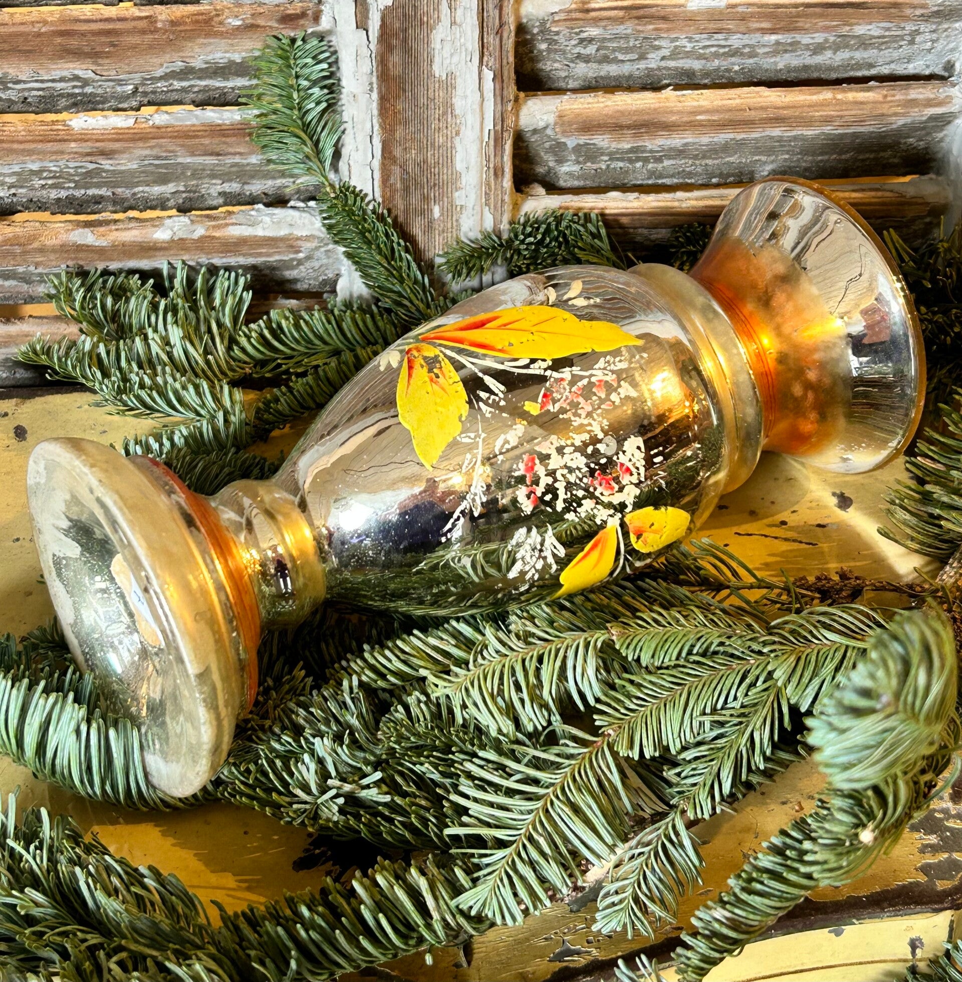Sfeervolle kwikglas (boerenzilver) vaas met een metallic goud/zilveren afwerking en decoratief bladmotief in warme herfstkleuren. Perfect voor herfst- en winterdecoratie, mooi met takken of droogbloemen.