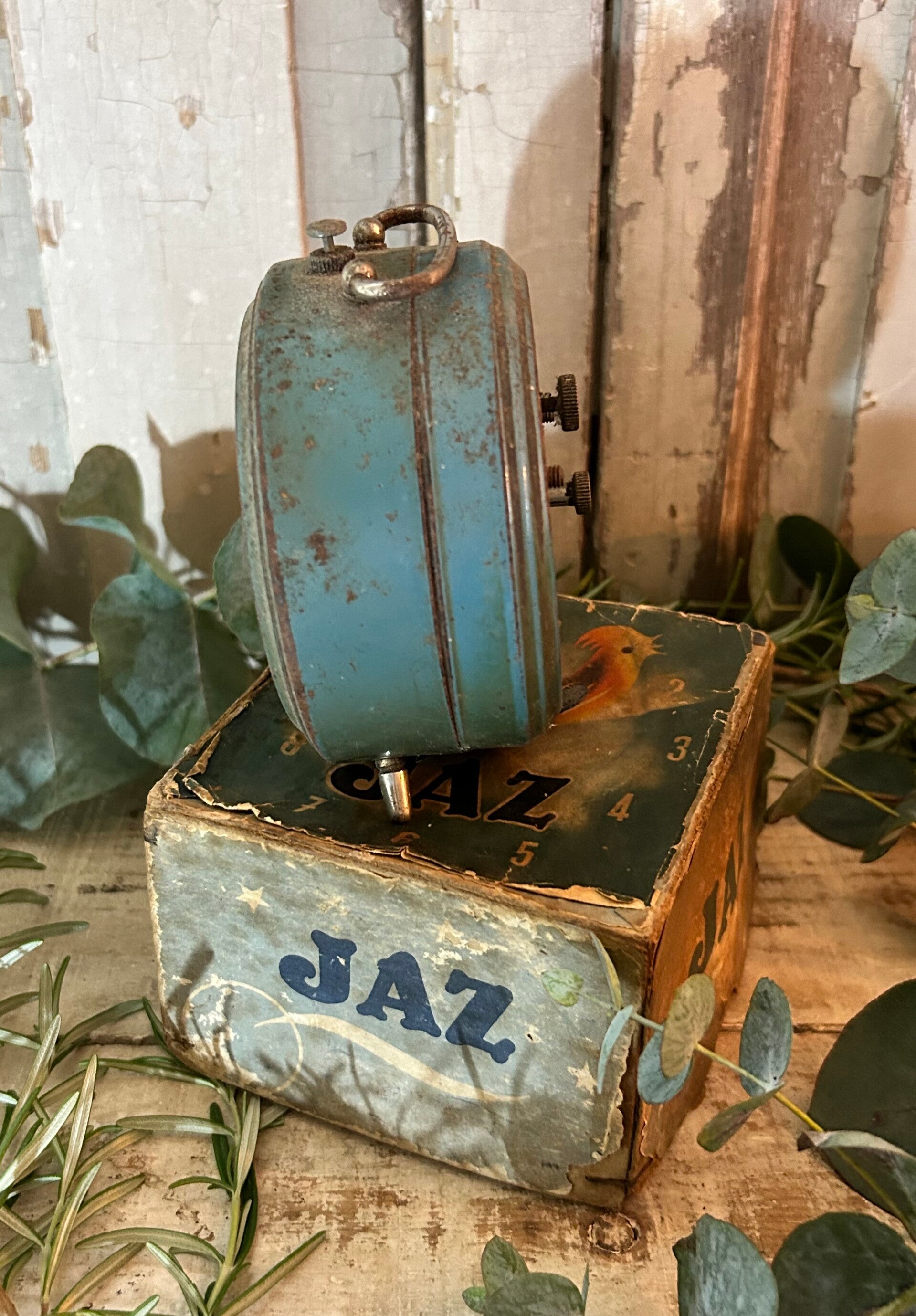 Authentieke oude metalen wekker van het Franse merk JAZ, uitgevoerd in blauw. De wekker heeft een mooie doorleefde uitstraling en wordt geleverd met het originele doosje, wat dit item extra bijzonder maakt voor verzamelaars en liefhebbers van vintage. Prachtig als decoratief accent in een brocante of retro interieur.