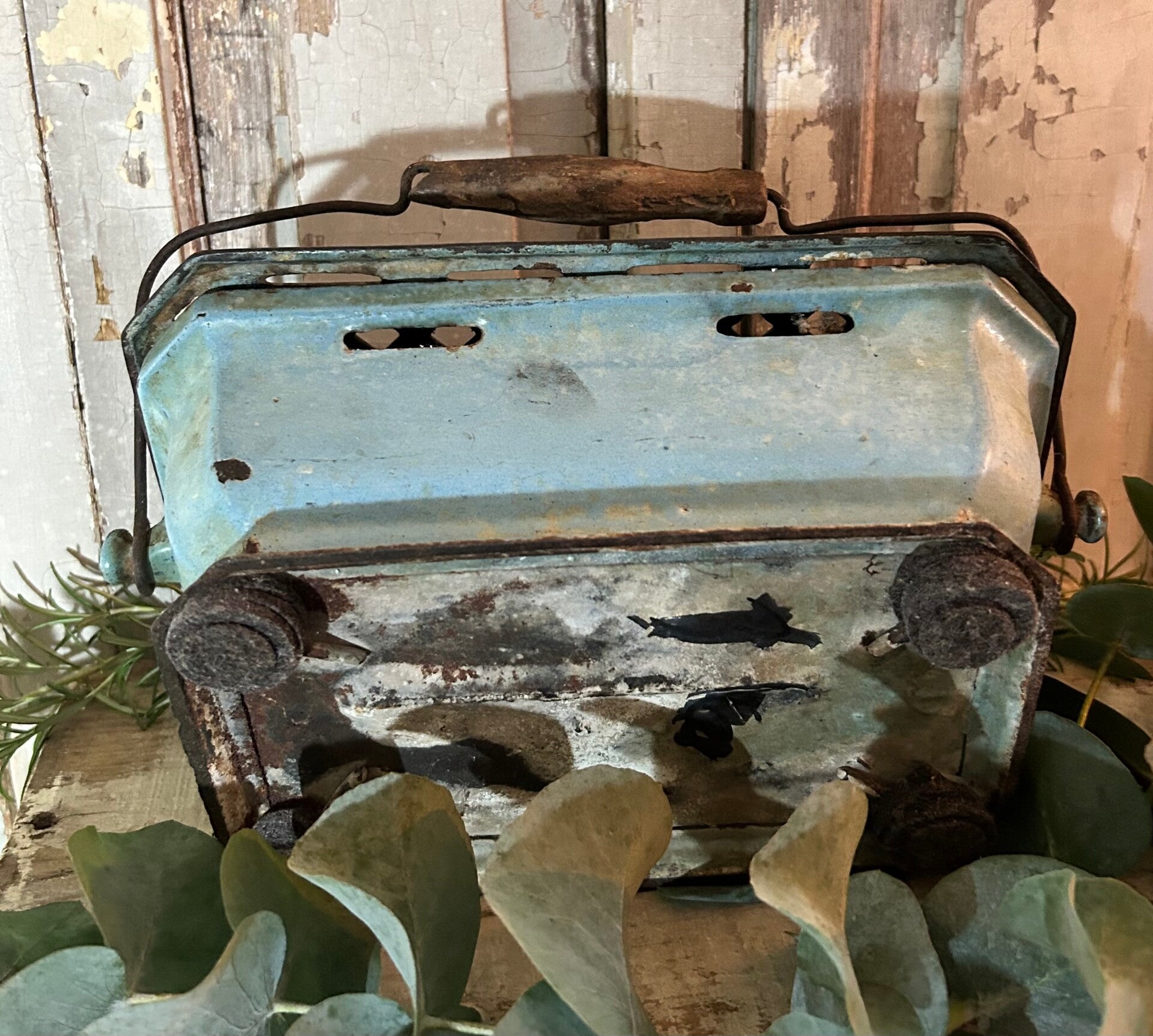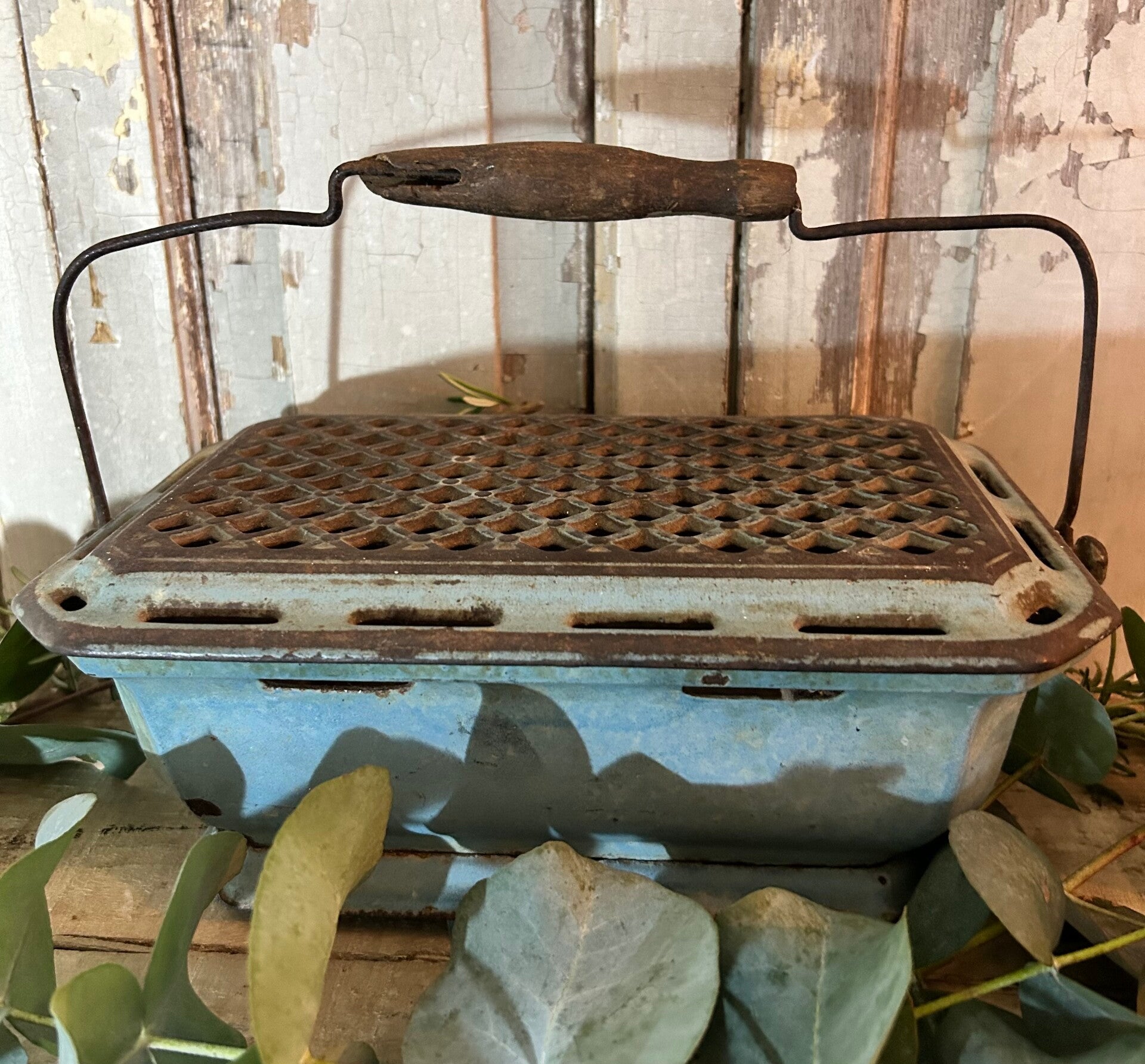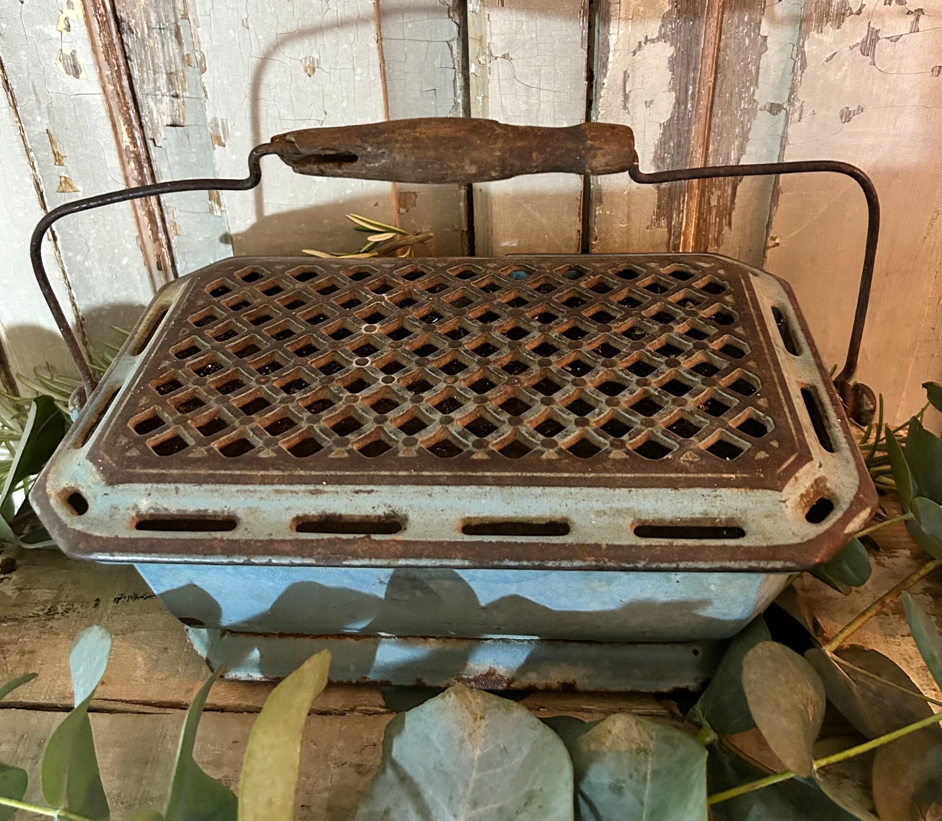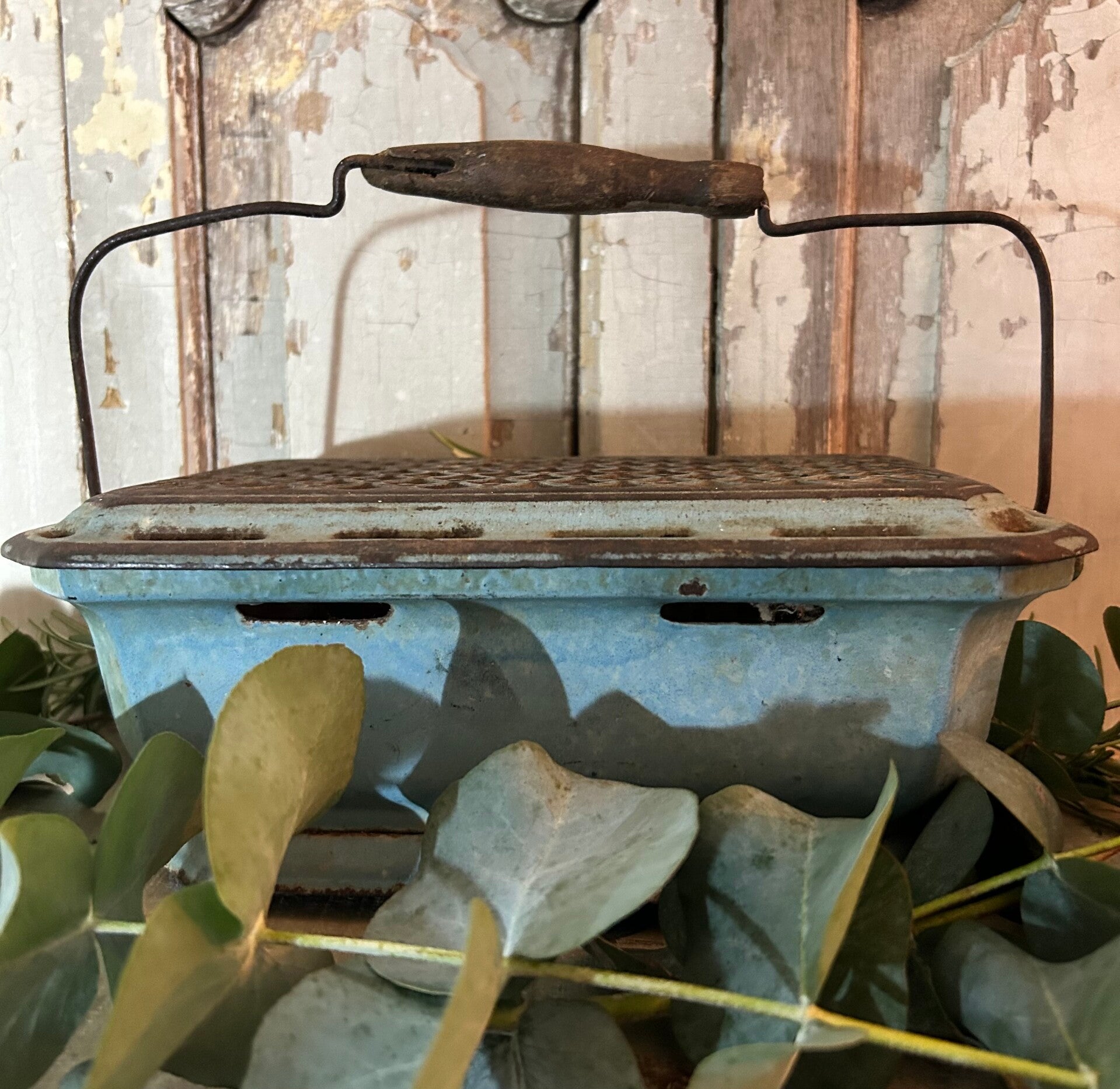 Authentieke Franse stoof met een prachtig doorleefde blauwe patina. Dit karaktervolle item straalt sfeer en historie uit en is een echte blikvanger in een landelijk, brocante of industrieel interieur. Mooi als decoratief object of ter styling in huis.