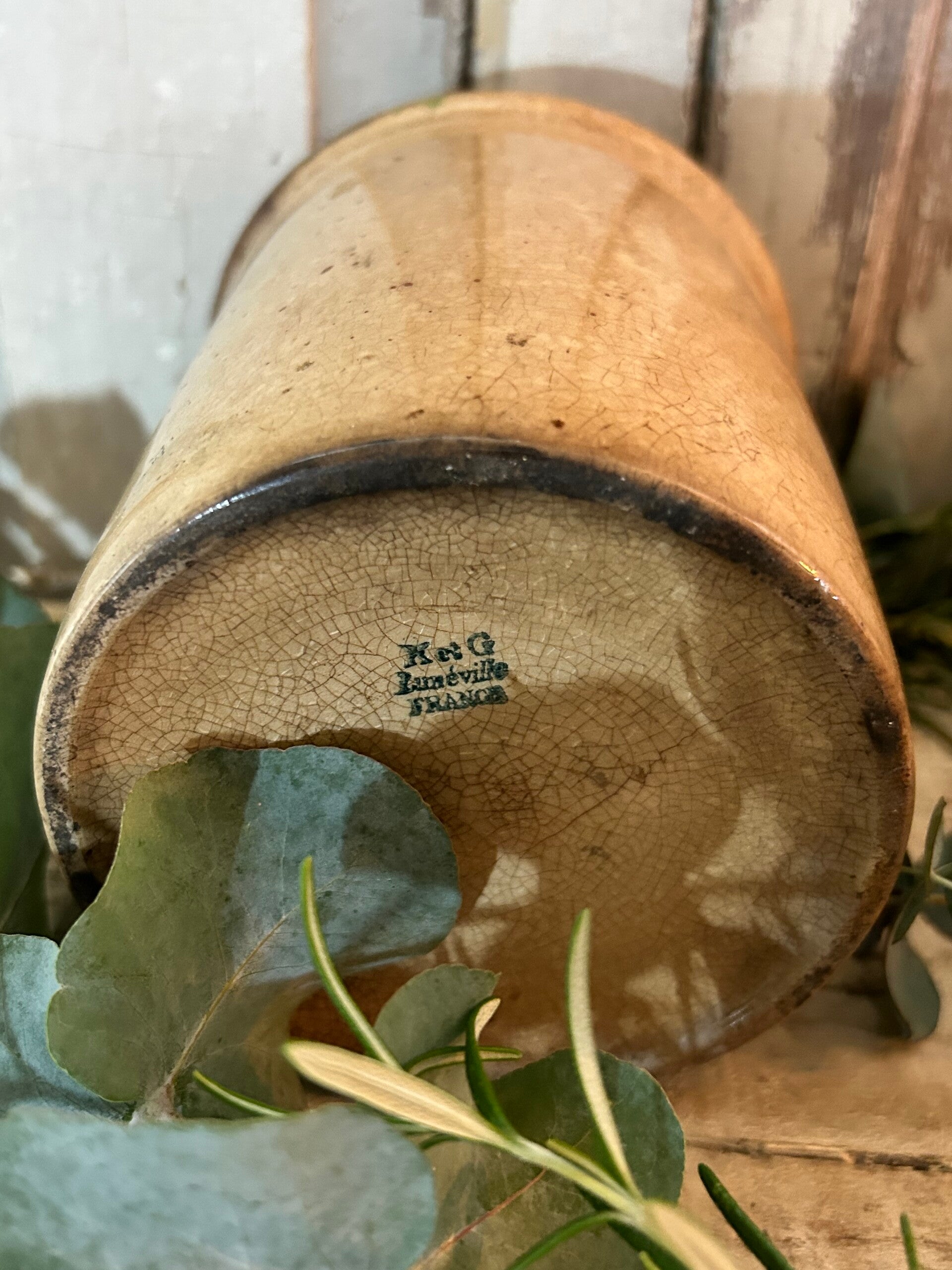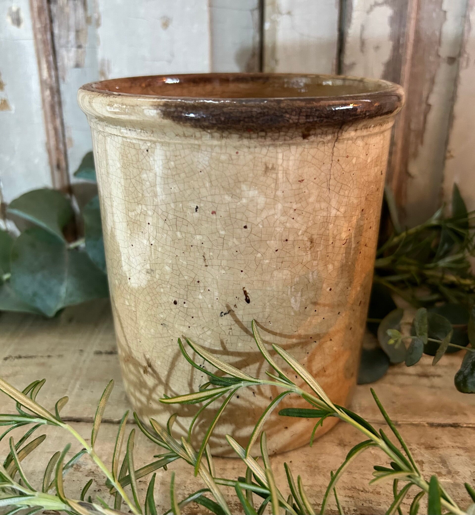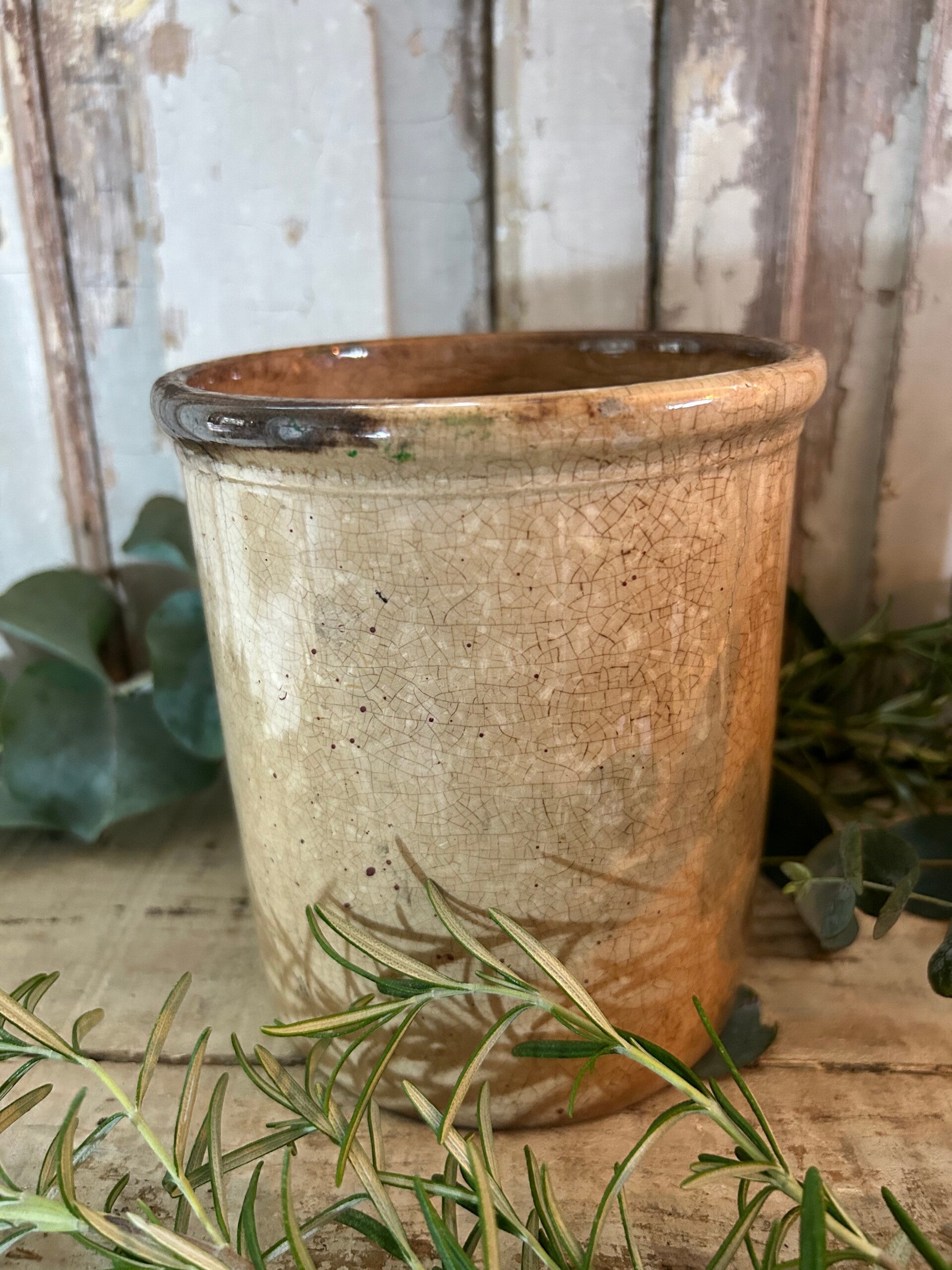 Vintage confitpot van Frans steengoed met rustieke, geglazuurde afwerking en natuurlijke ouderdomssporen (“beboterd”).