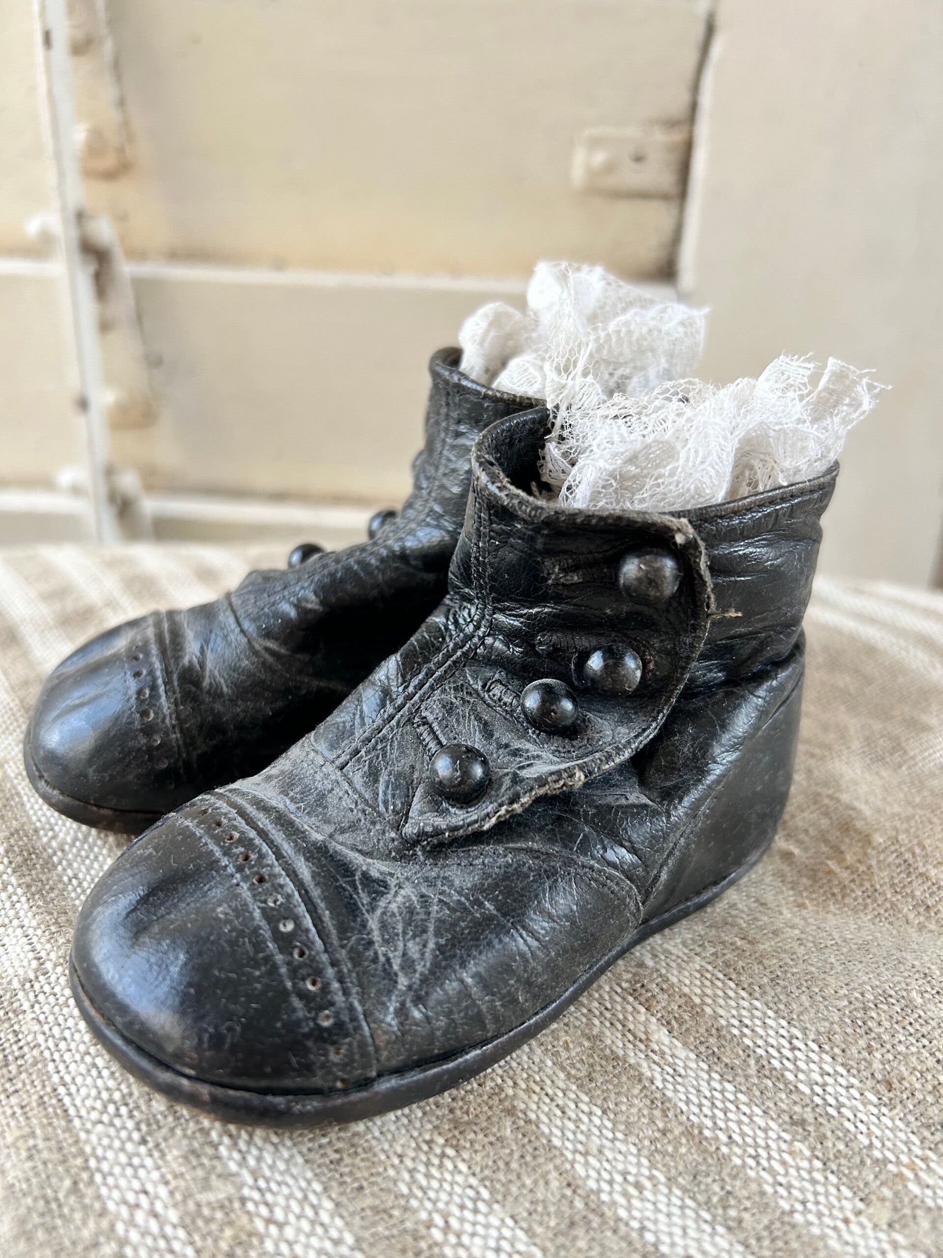 Antieke zwarte leren kinderschoenen met knoopsluitingen.