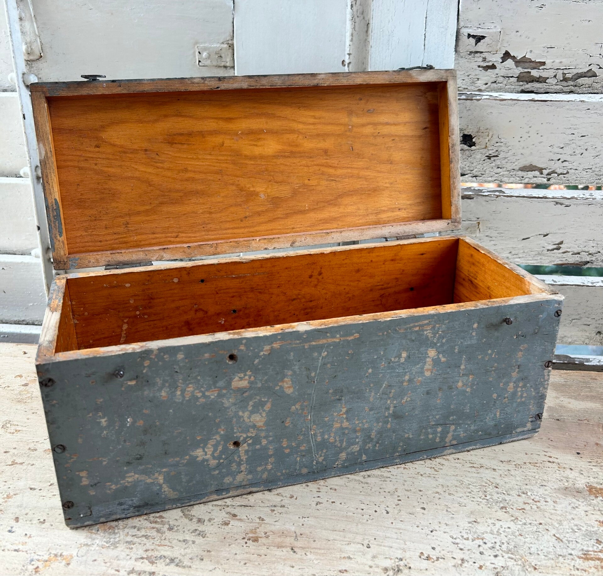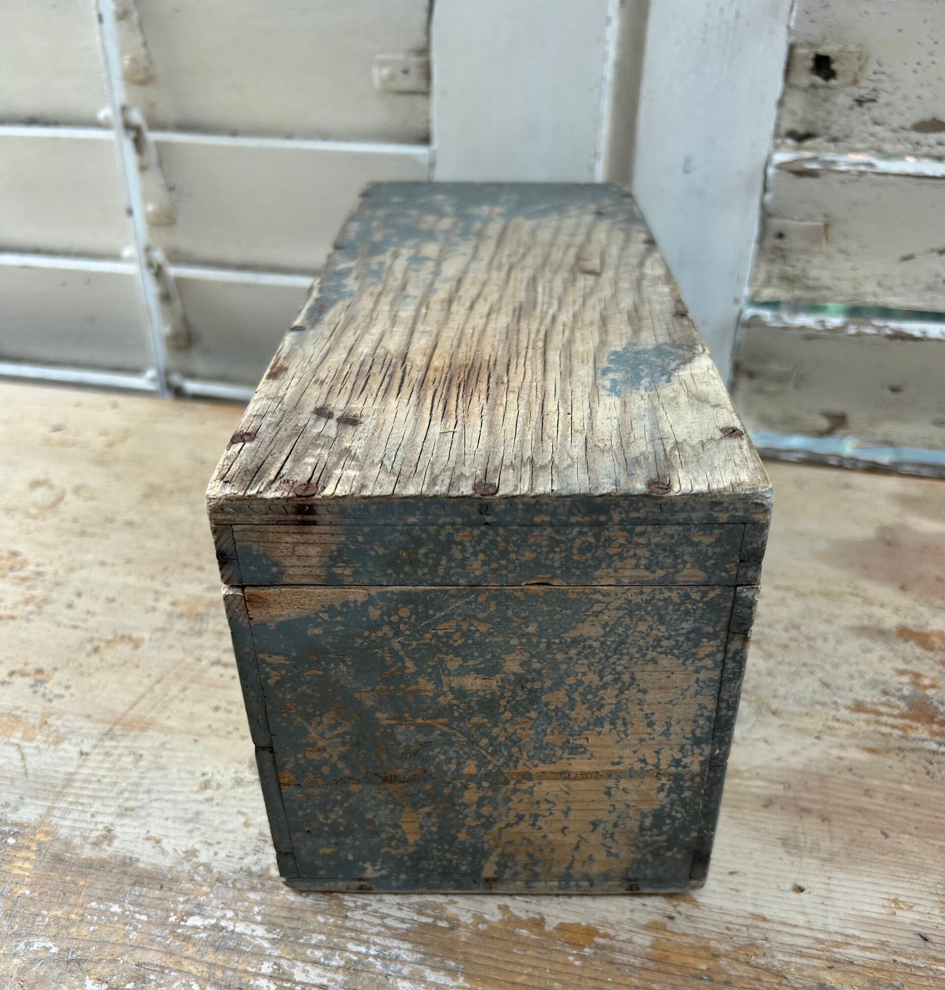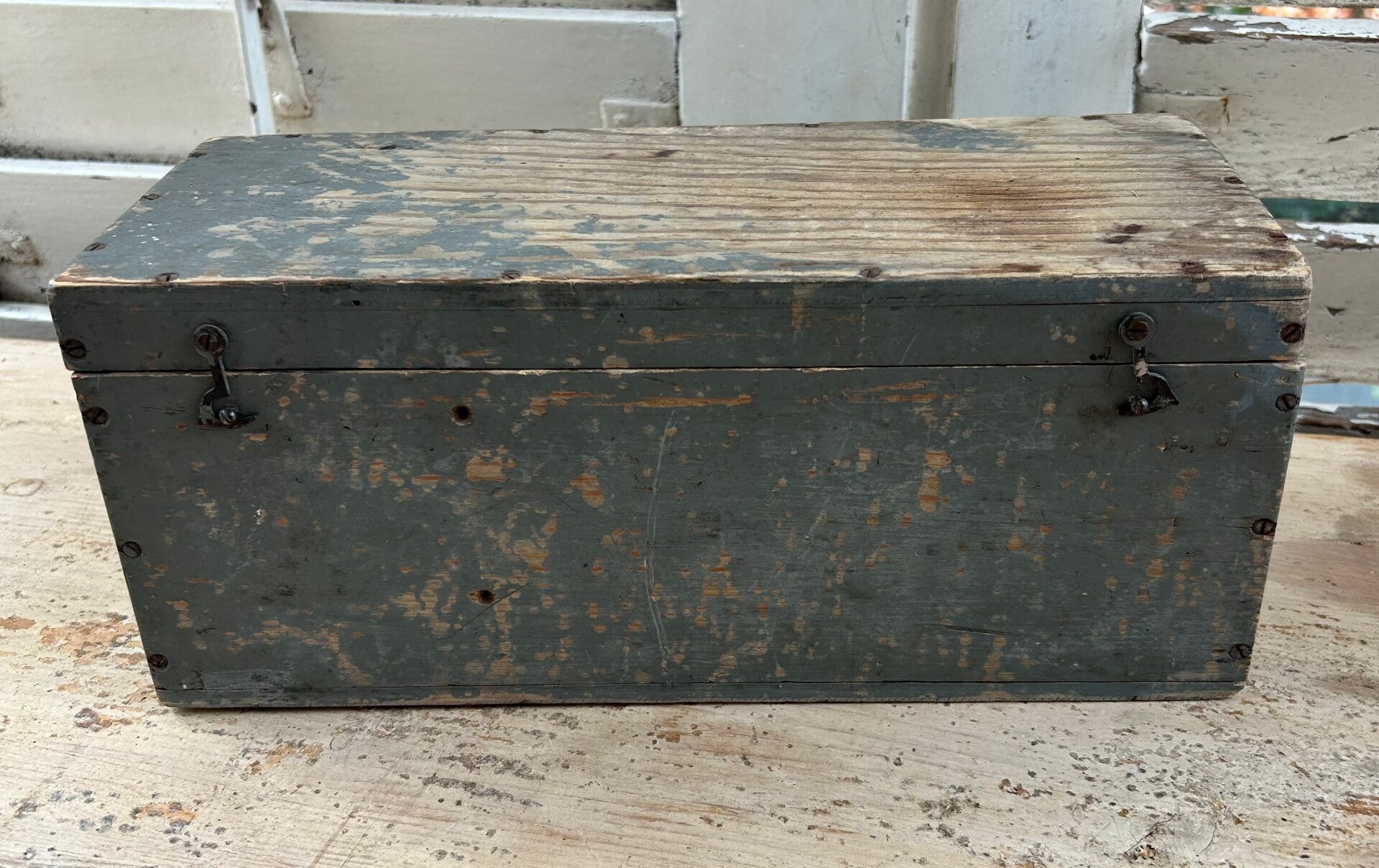 Prachtige oude houten kist met een doorleefde uitstraling. De verweerde groen/blauwe verflaag en de subtiele gebruikssporen geven deze kist een authentiek en warm karakter. Een item met geschiedenis dat direct sfeer brengt in huis.