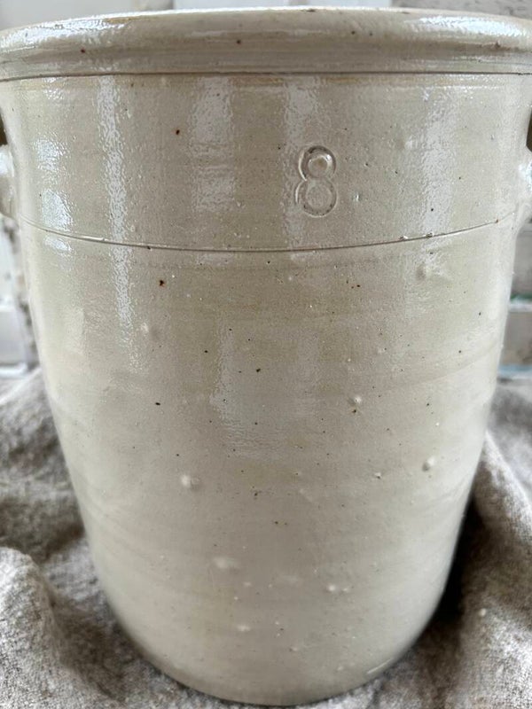 Prachtige grespot in natuurlijke tinten met twee karakteristieke oren. De sobere glazuur en tijdloze vorm geven dit stuk een rustige, authentieke uitstraling.